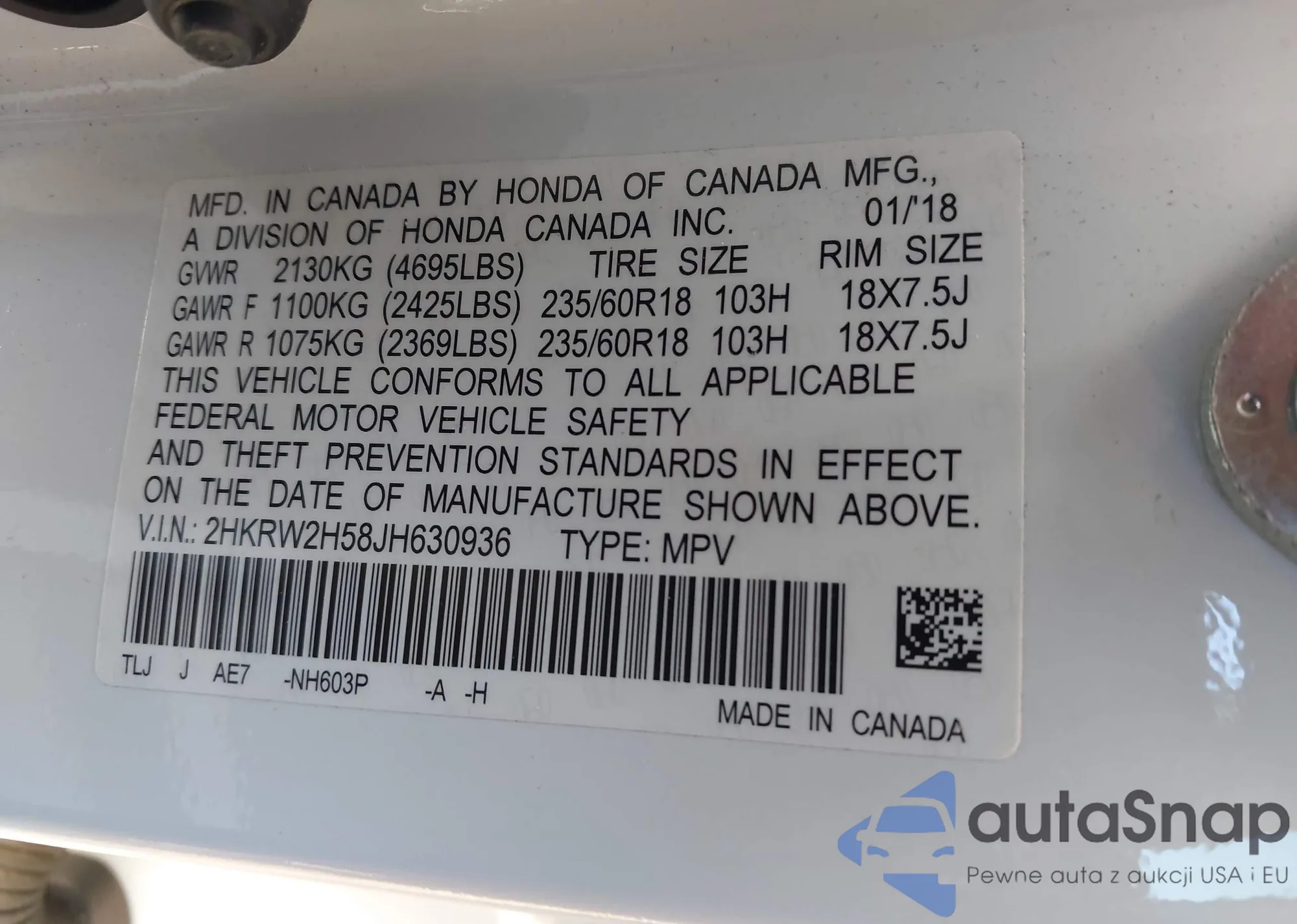VIN: 2HKRW2H58JH630936