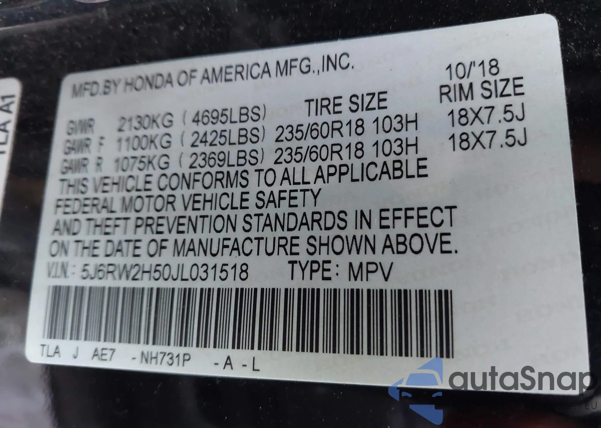 VIN: 5J6RW2H50JL031518