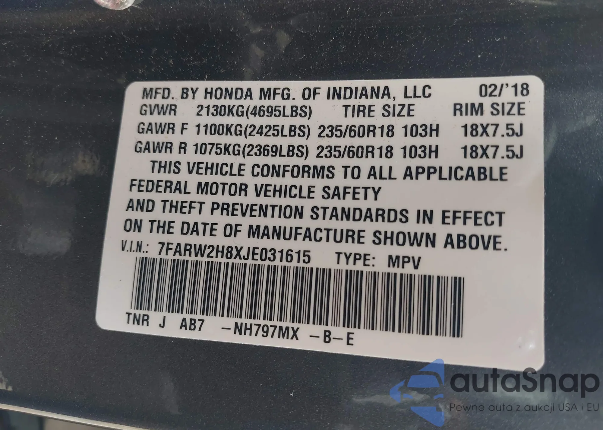 VIN: 7FARW2H8XJE031615