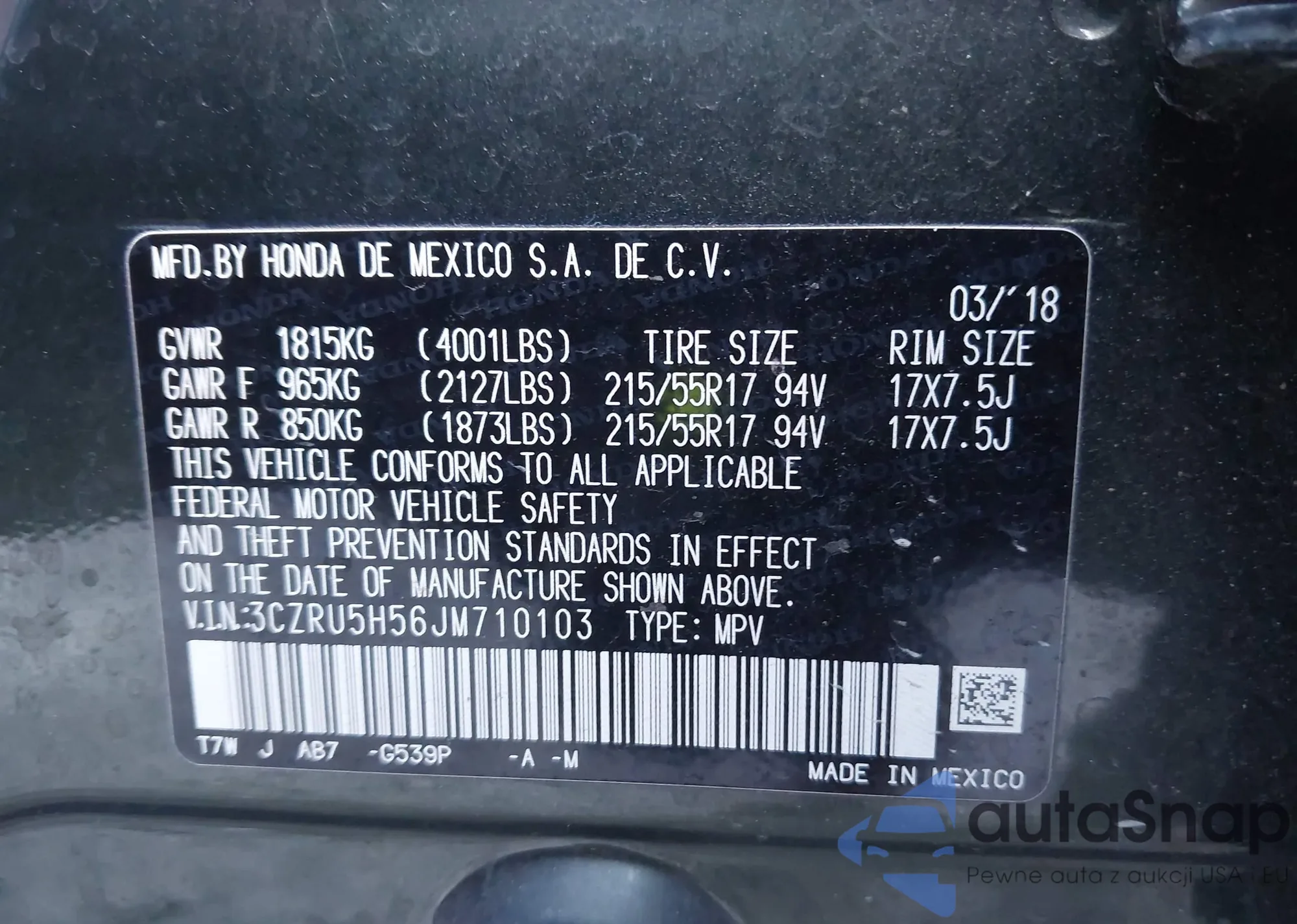 Samochód Honda HR-V 2018 (VIN 3CZRU5H56JM710103) ma dokumenty uniemożliwiające rejestrację. Mogą pojawić się trudności przy eksporcie i rejestracji. Skontaktuj się z ekspertami AutaSnap w celu znalezienia alternatywy.