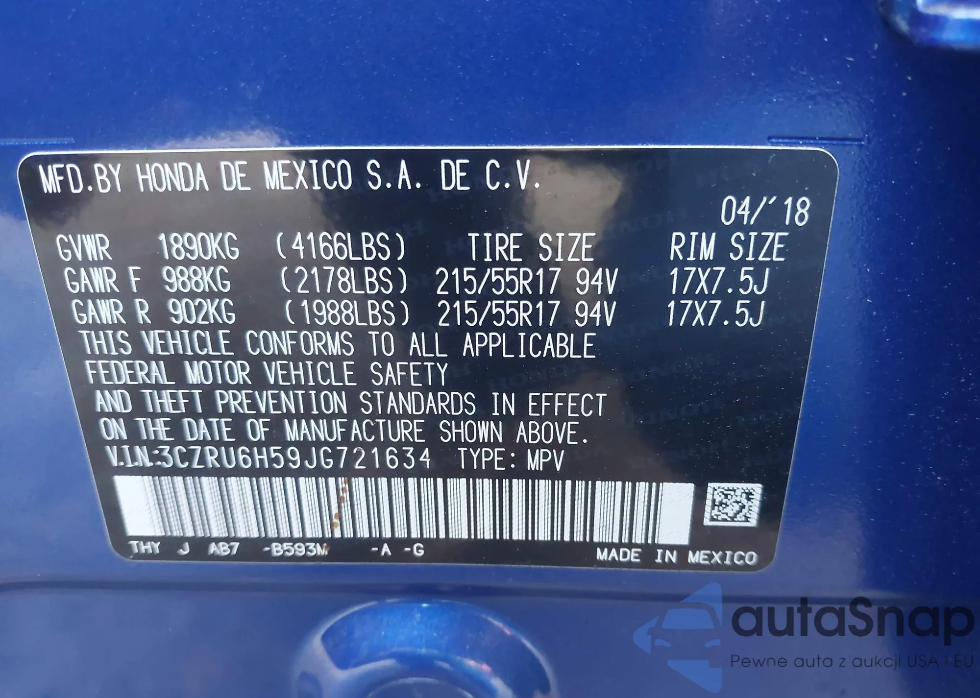 Samochód Honda HR-V 2018 (VIN 3CZRU6H59JG721634) nie był wcześniej licytowany. Dokumenty są czyste, przebieg odpowiada lub jest niższy niż średnia rynku. Sprzedaje go firma ubezpieczeniowa – polecamy zakup. Dostawa do portu zajmie ok. 6–8 tygodni.
