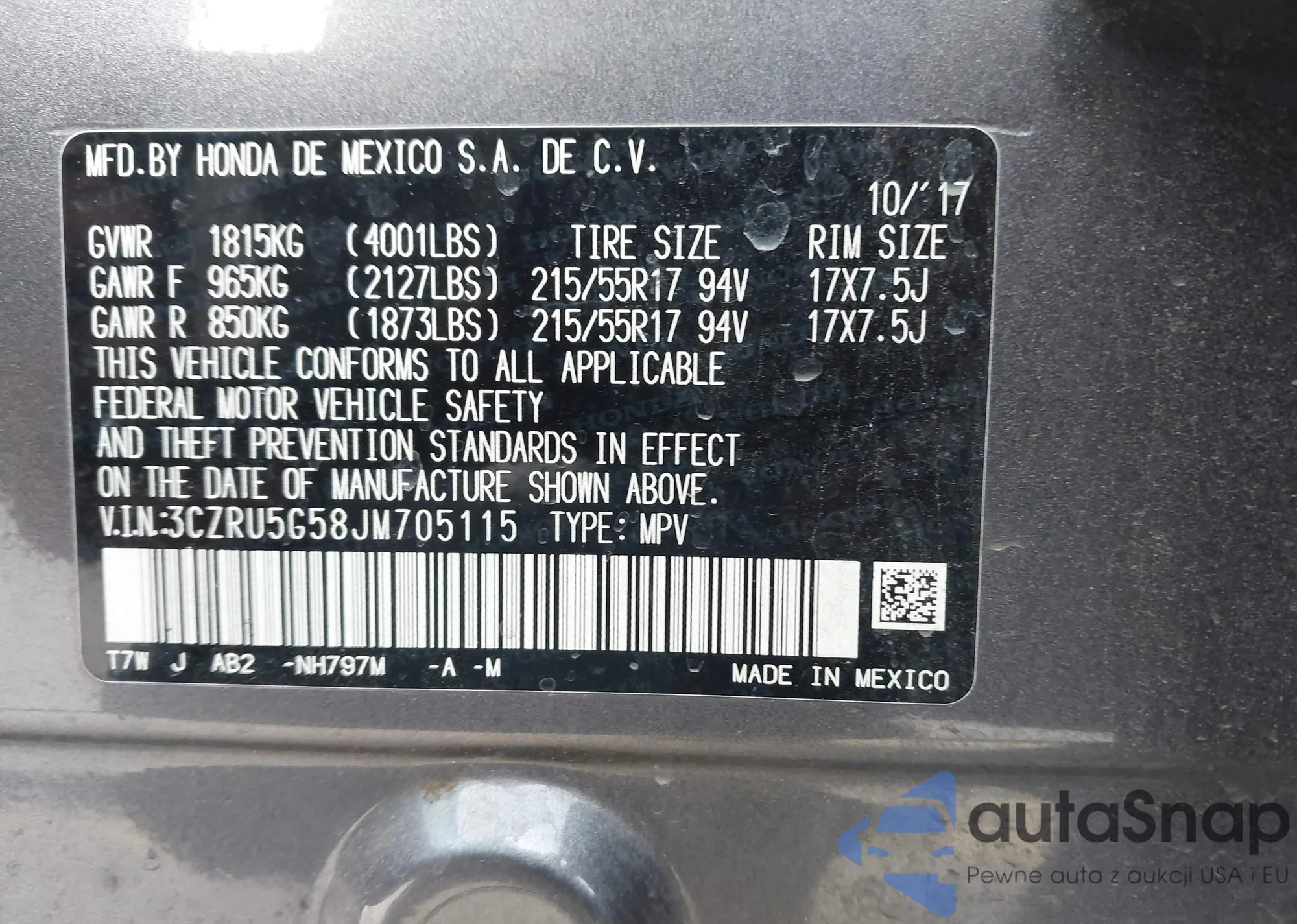 Samochód Honda HR-V 2018 (VIN 3CZRU5G58JM705115) nie był wcześniej licytowany. Dokumenty są czyste, przebieg odpowiada lub jest niższy niż średnia rynku. Sprzedaje go firma ubezpieczeniowa – polecamy zakup. Dostawa do portu zajmie ok. 6–8 tygodni.