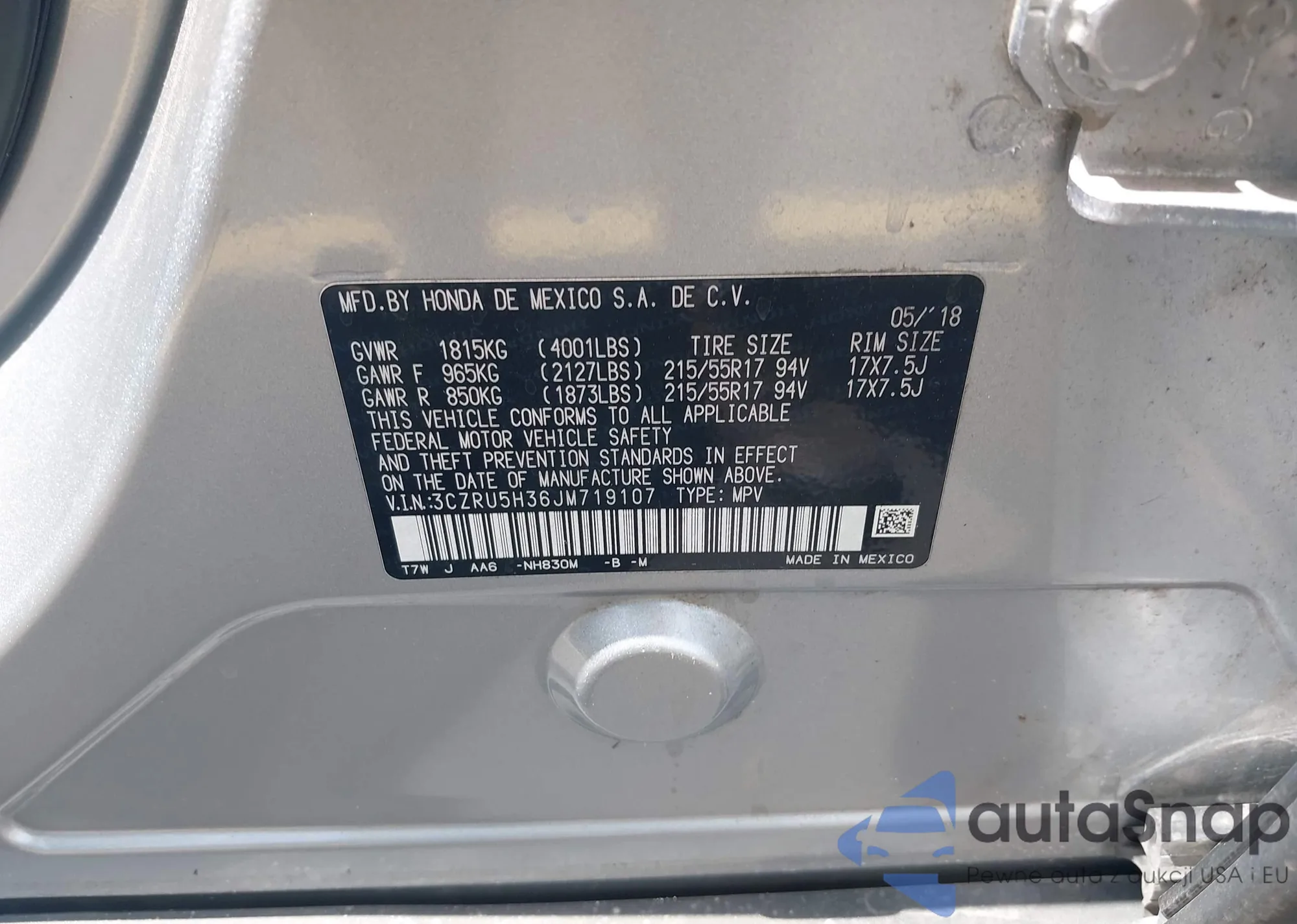 VIN: 3CZRU5H36JM719107