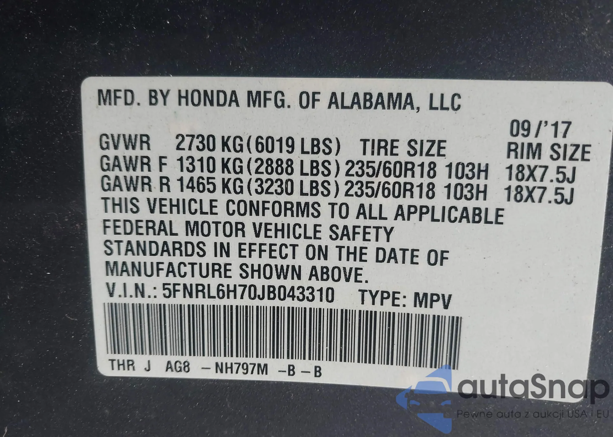 VIN: 5FNRL6H70JB043310