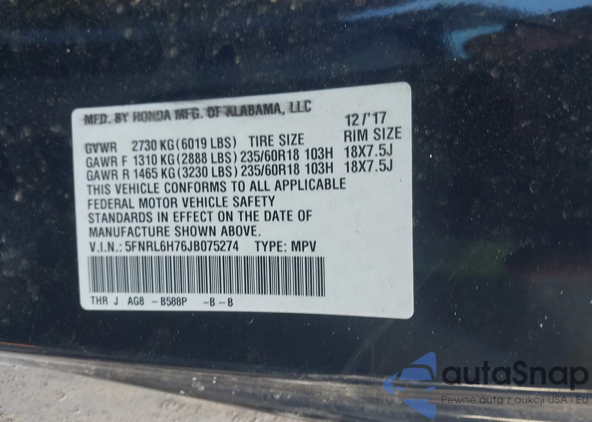 • VIN: 5FNRL6H76JB075274