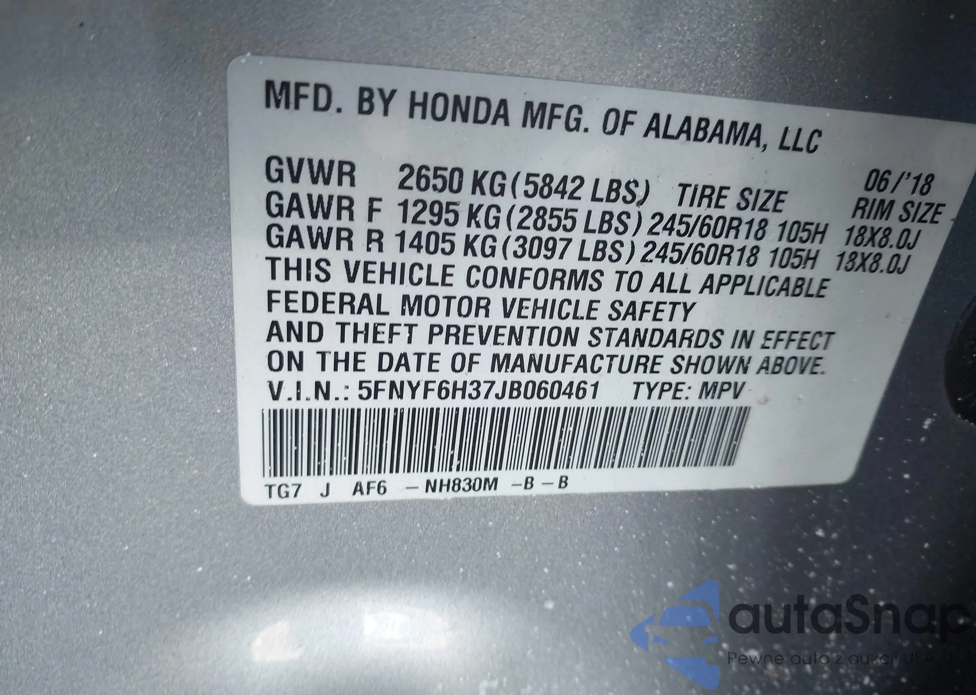 Samochód Honda Pilot 2018 (VIN 5FNYF6H37JB060461) nie był wcześniej licytowany. Dokumenty są czyste, przebieg odpowiada lub jest niższy niż średnia rynku. Sprzedaje go firma ubezpieczeniowa – polecamy zakup. Dostawa do portu zajmie ok. 6–8 tygodni.