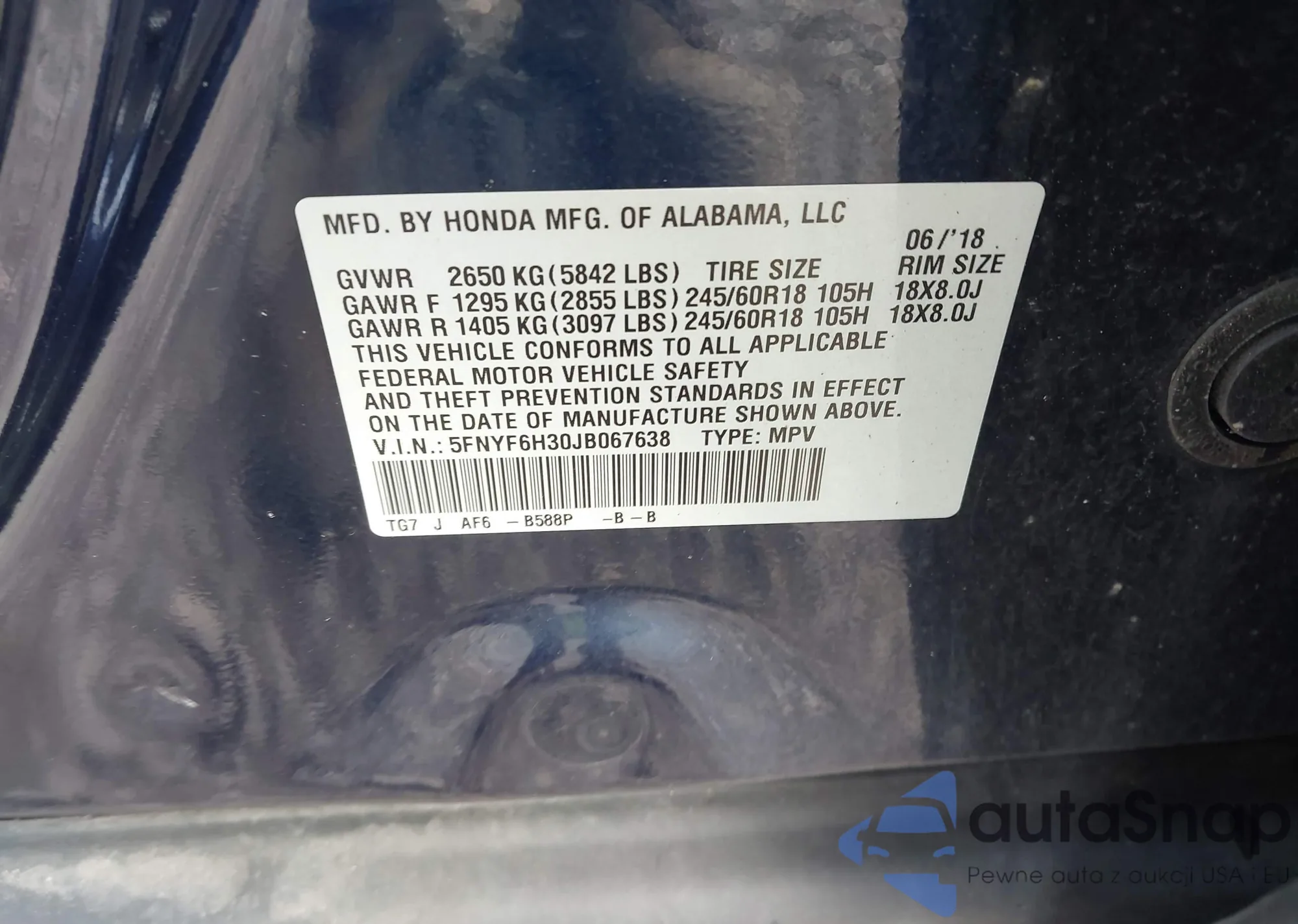 VIN: 5FNYF6H30JB067638