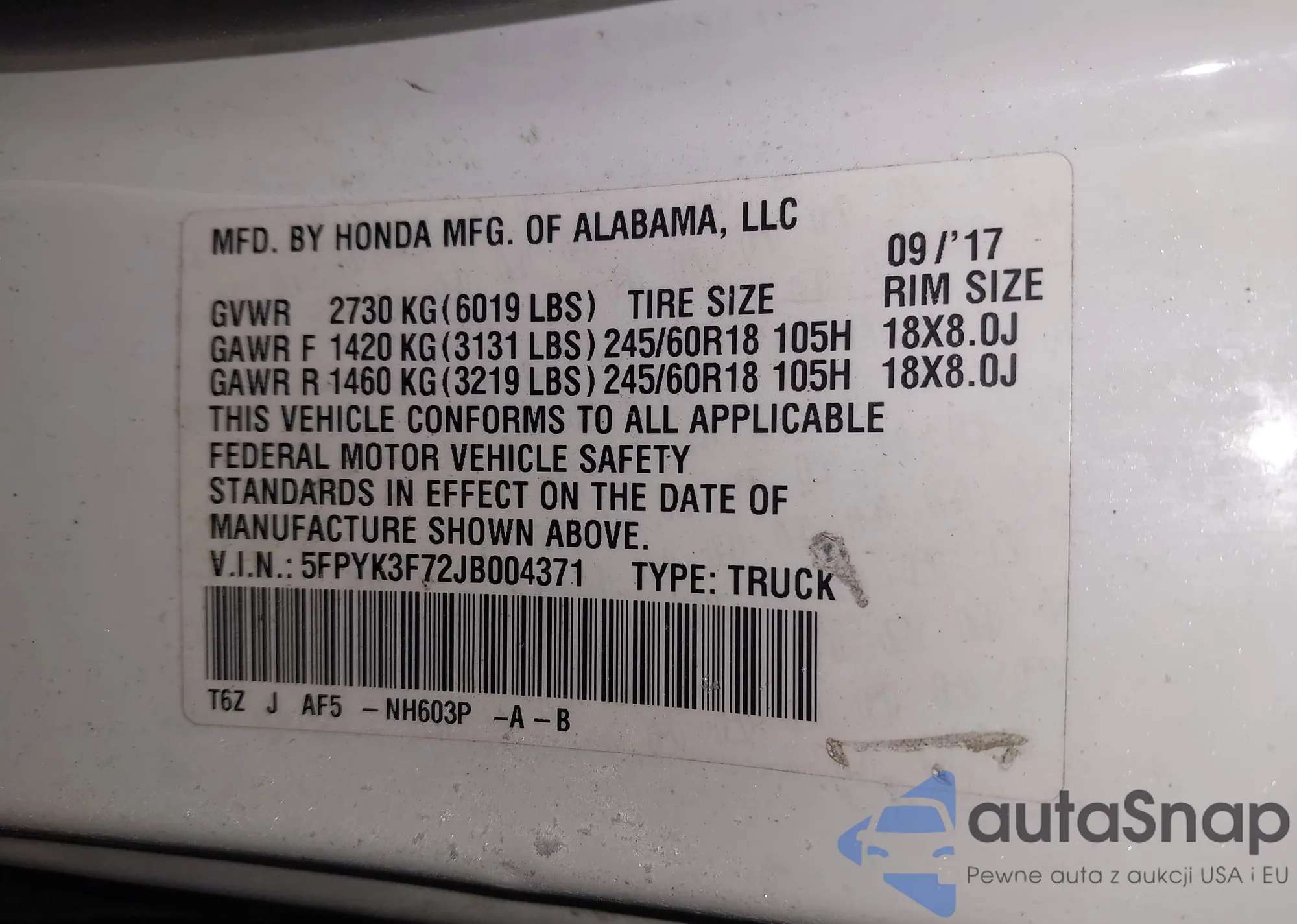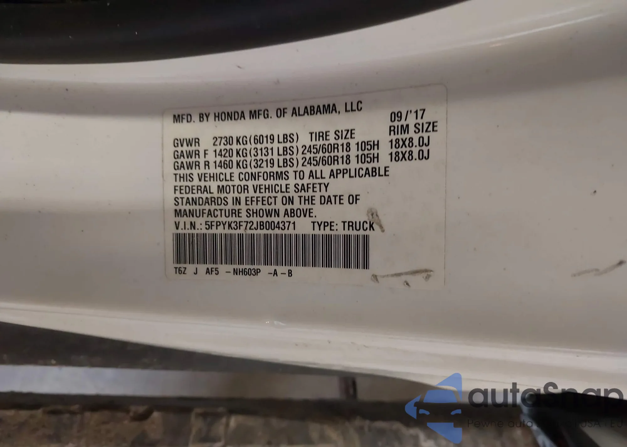 Samochód Honda Ridgeline 2018 (VIN 5FPYK3F72JB004371) nie był wcześniej licytowany. Dokumenty są czyste, przebieg odpowiada lub jest niższy niż średnia rynku. Sprzedaje go firma ubezpieczeniowa – polecamy zakup. Dostawa do portu zajmie ok. 6–8 tygodni.