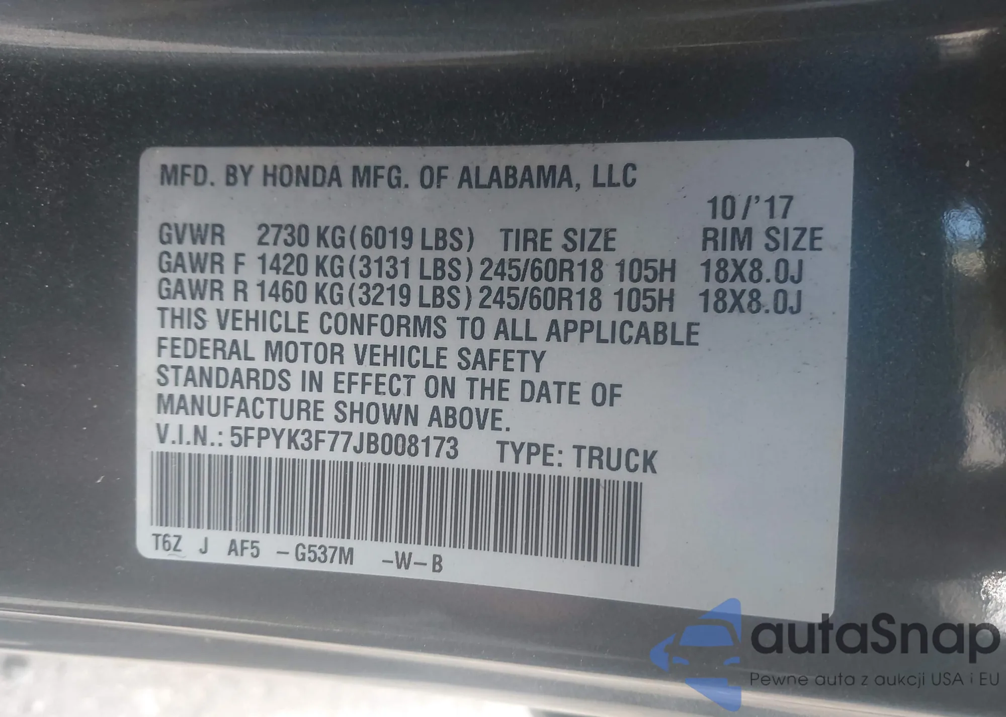 VIN: 5FPYK3F77JB008173