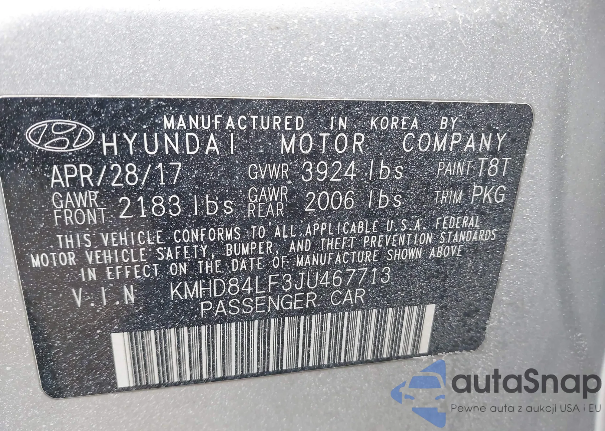 Samochód Hyundai Elantra 2018 (VIN KMHD84LF3JU467713) nie był wcześniej licytowany. Dokumenty są czyste, przebieg odpowiada lub jest niższy niż średnia rynku. Sprzedaje go firma ubezpieczeniowa – polecamy zakup. Dostawa do portu zajmie ok. 6–8 tygodni.