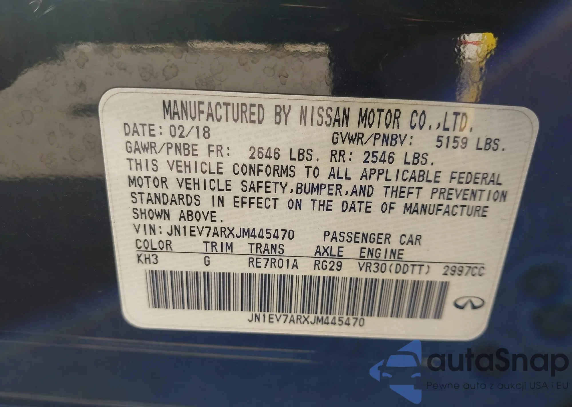 Samochód Infiniti Q50 2018 (VIN JN1EV7ARXJM445470) nie był wcześniej licytowany. Dokumenty są czyste, przebieg odpowiada lub jest niższy niż średnia rynku. Sprzedaje go firma ubezpieczeniowa – polecamy zakup. Dostawa do portu zajmie ok. 6–8 tygodni.