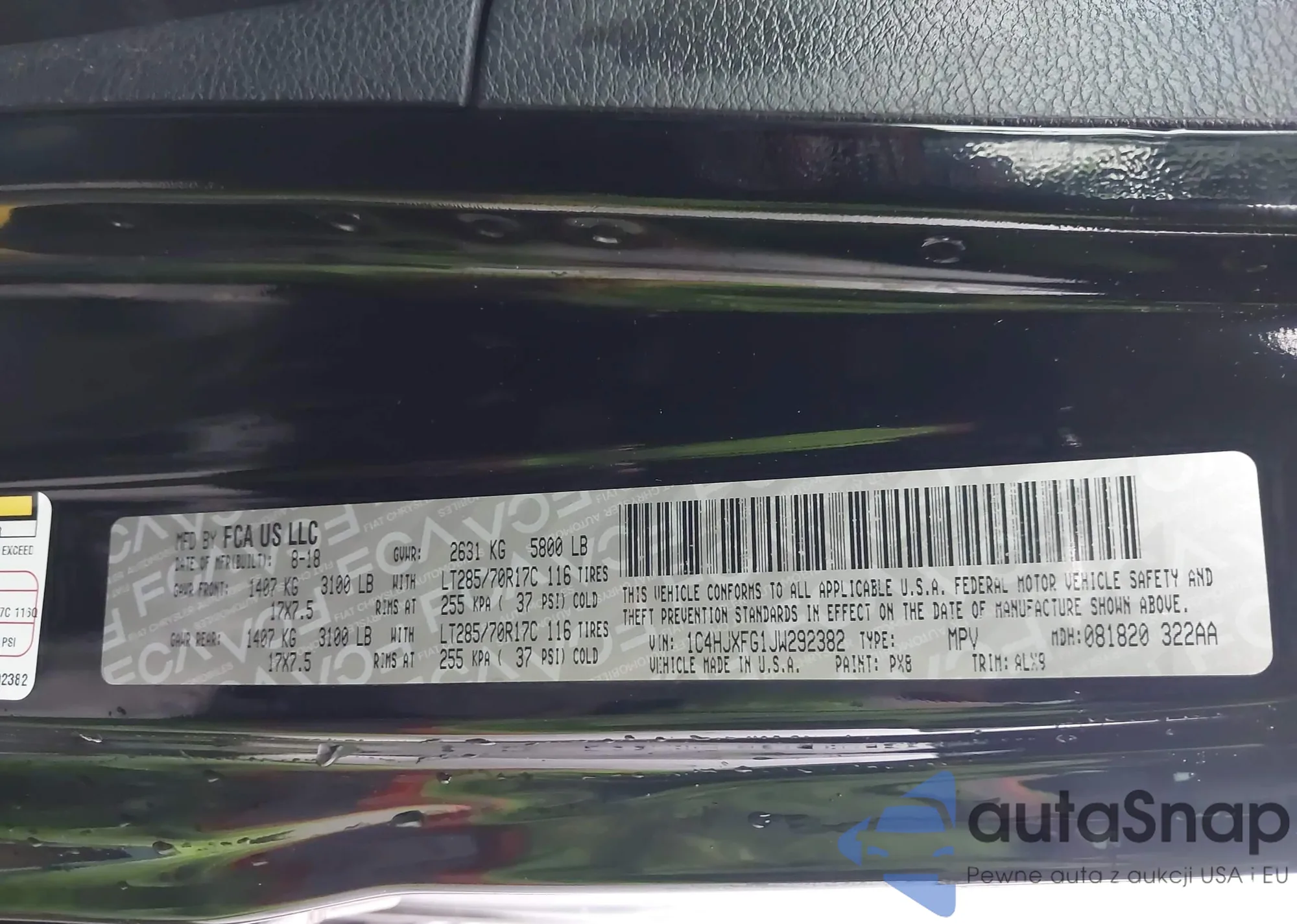 Samochód Jeep Wrangler 2018 (VIN 1C4HJXFG1JW292382) nie był wcześniej licytowany. Dokumenty są czyste, przebieg odpowiada lub jest niższy niż średnia rynku. Sprzedaje go firma ubezpieczeniowa – polecamy zakup. Dostawa do portu zajmie ok. 6–8 tygodni.