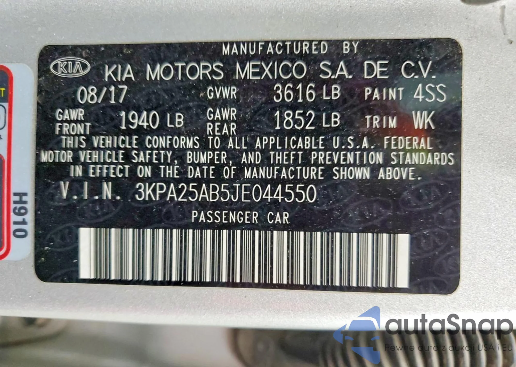 Samochód Kia Rio 2018 (VIN 3KPA25AB5JE044550) ma dokumenty uniemożliwiające rejestrację. Mogą pojawić się trudności przy eksporcie i rejestracji. Skontaktuj się z ekspertami AutaSnap w celu znalezienia alternatywy.
