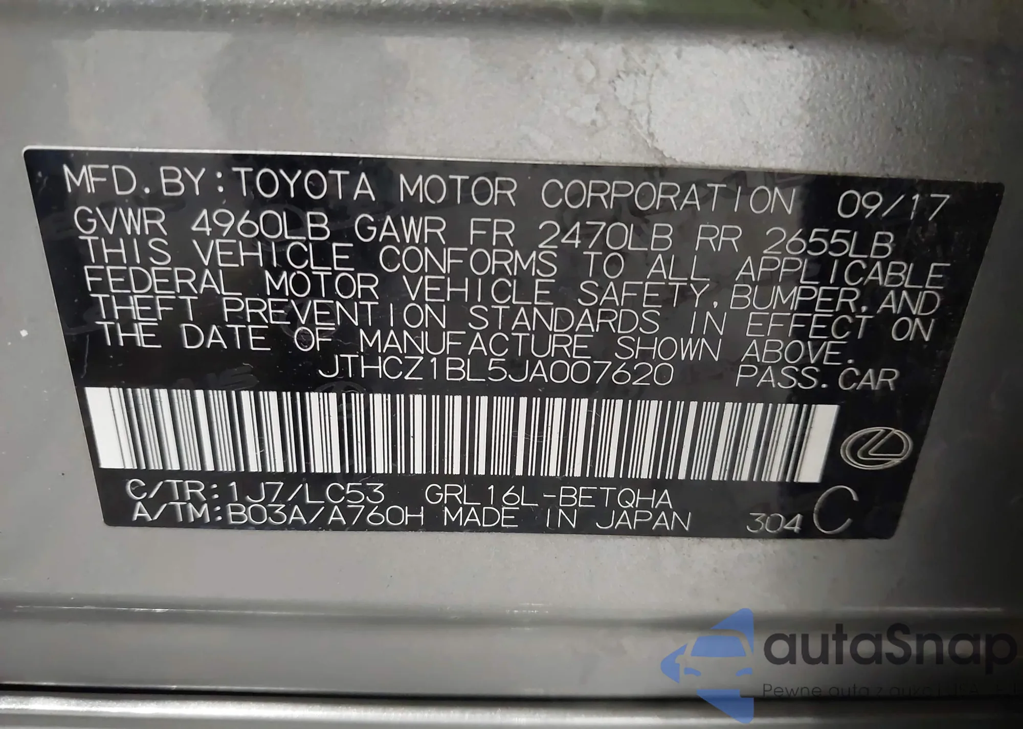 VIN: JTHCZ1BL5JA007620