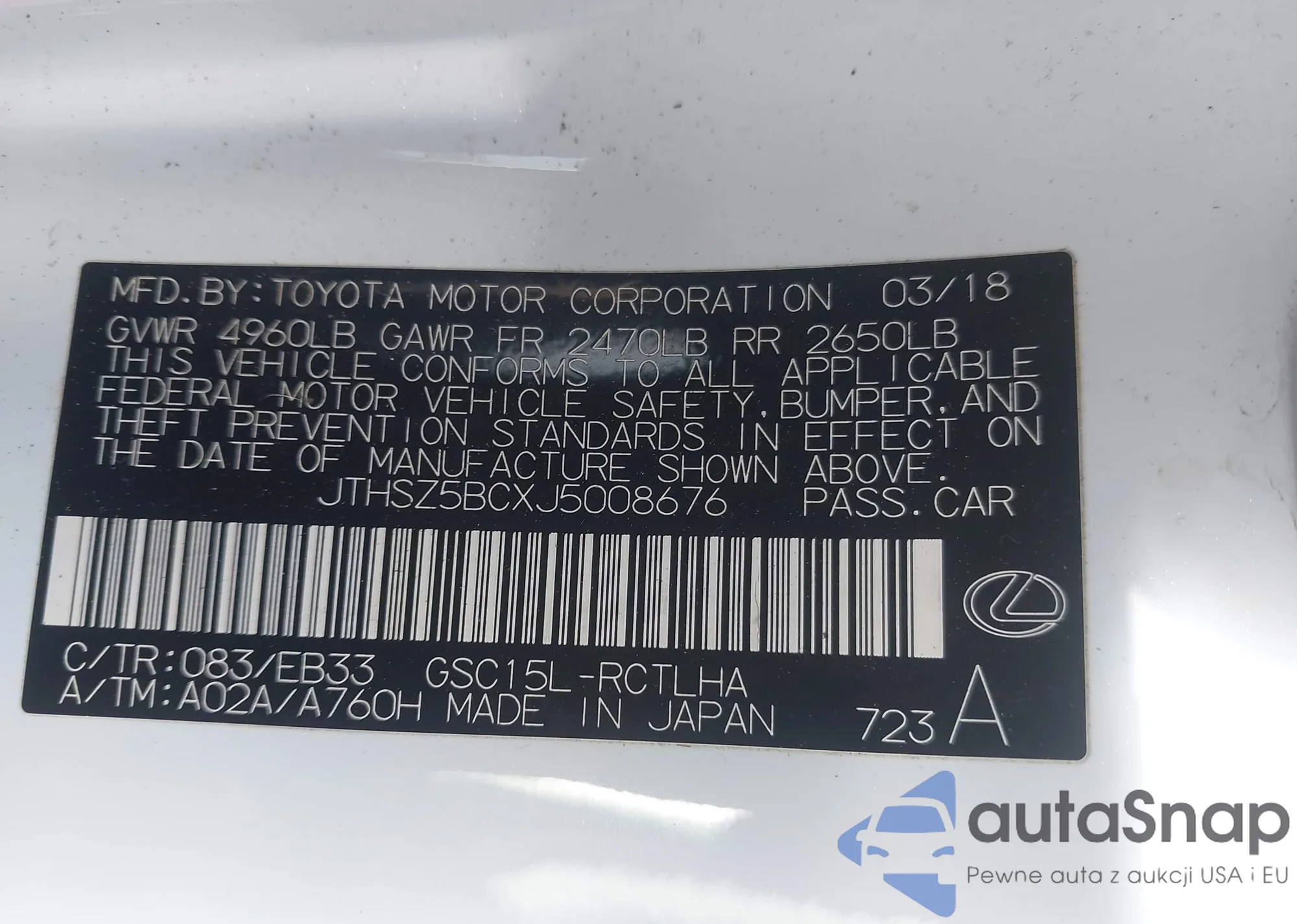 VIN: JTHSZ5BCXJ5008676