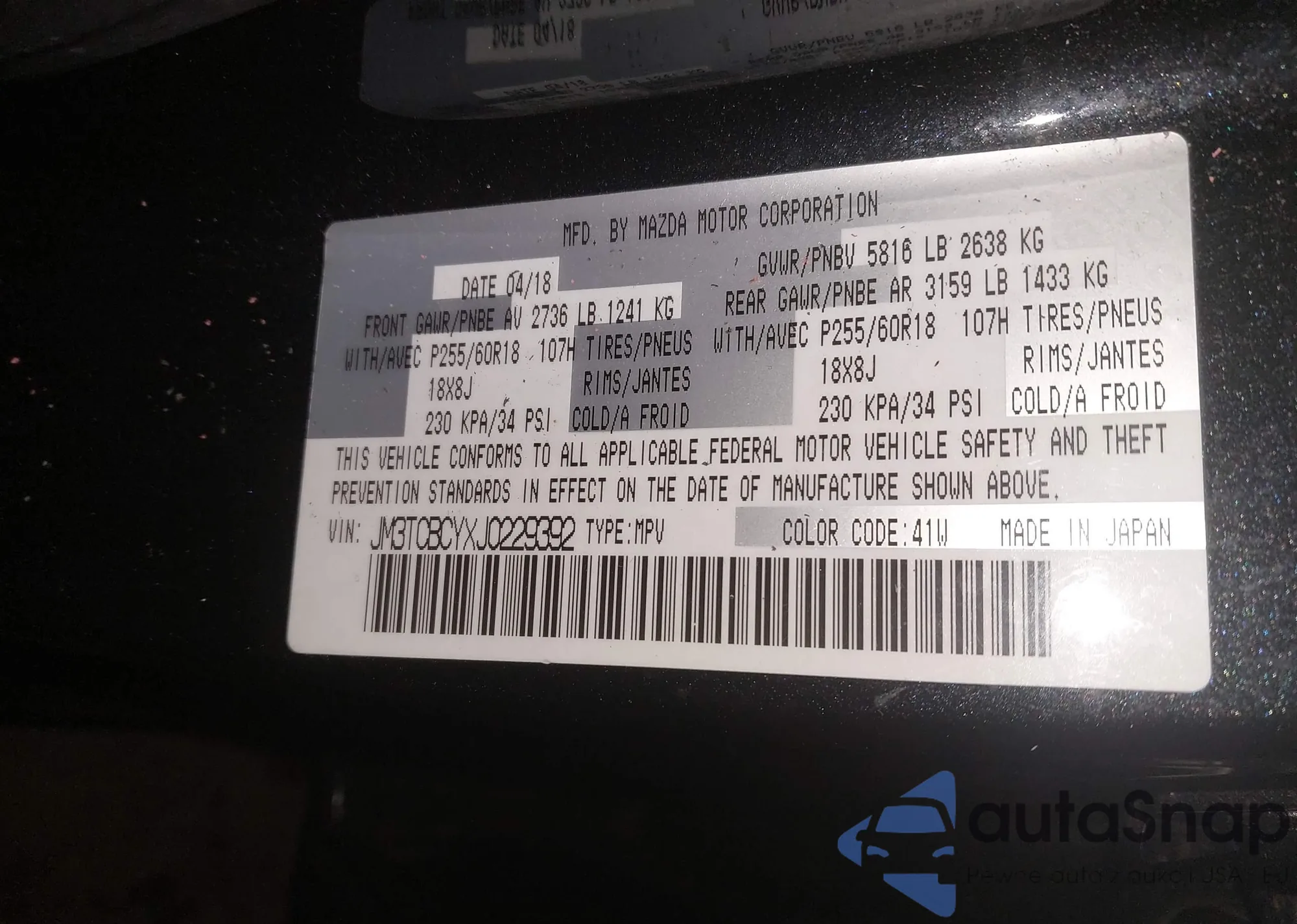 Samochód Mazda CX-9 2018 (VIN JM3TCBCYXJ0229392) nie był wcześniej licytowany. Dokumenty są czyste, przebieg odpowiada lub jest niższy niż średnia rynku. Sprzedaje go firma ubezpieczeniowa – polecamy zakup. Dostawa do portu zajmie ok. 6–8 tygodni.