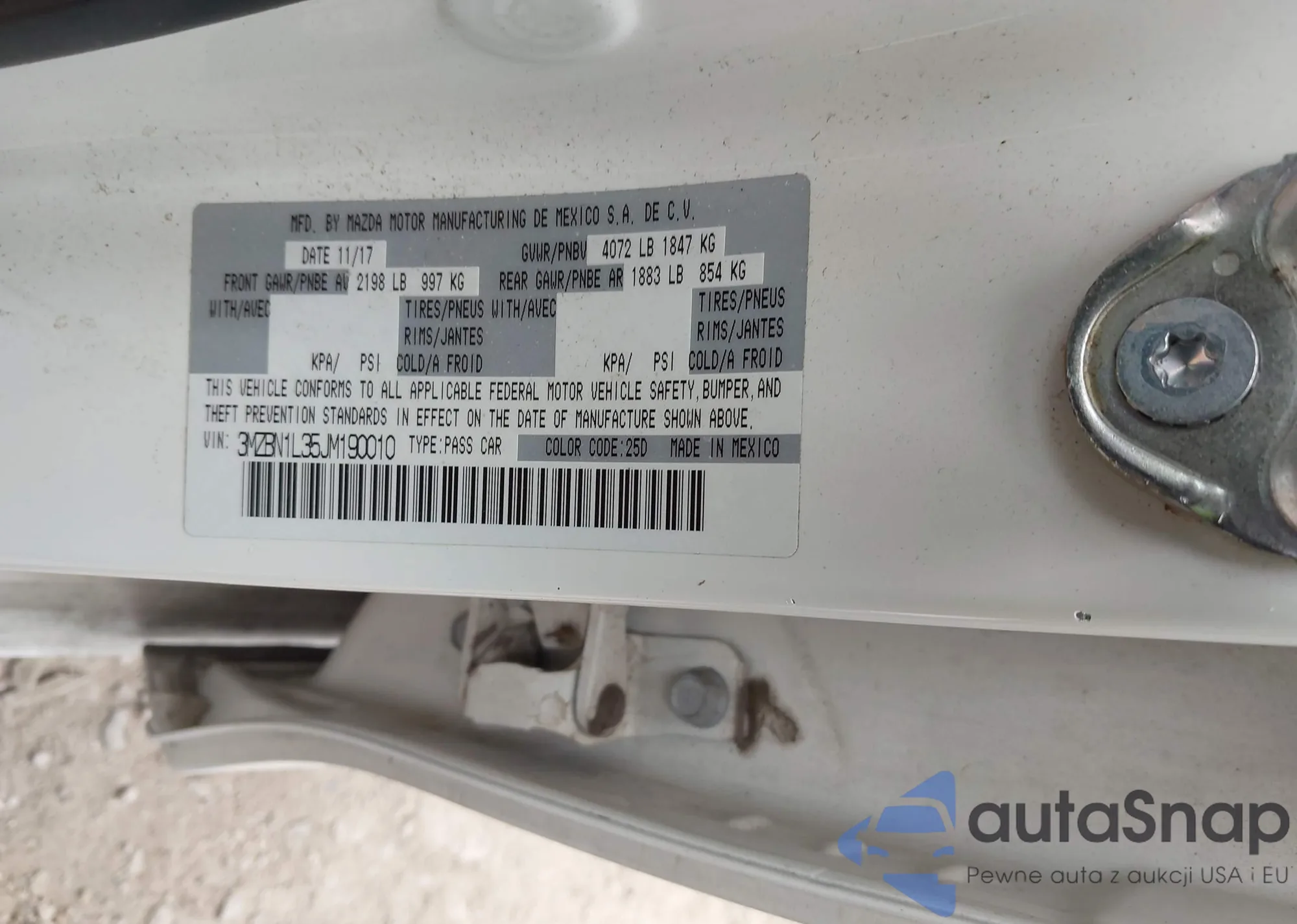 Samochód Mazda 3 2018 (VIN 3MZBN1L35JM190010) nie był wcześniej licytowany. Dokumenty są czyste, przebieg odpowiada lub jest niższy niż średnia rynku. Sprzedaje go firma ubezpieczeniowa – polecamy zakup. Dostawa do portu zajmie ok. 6–8 tygodni.