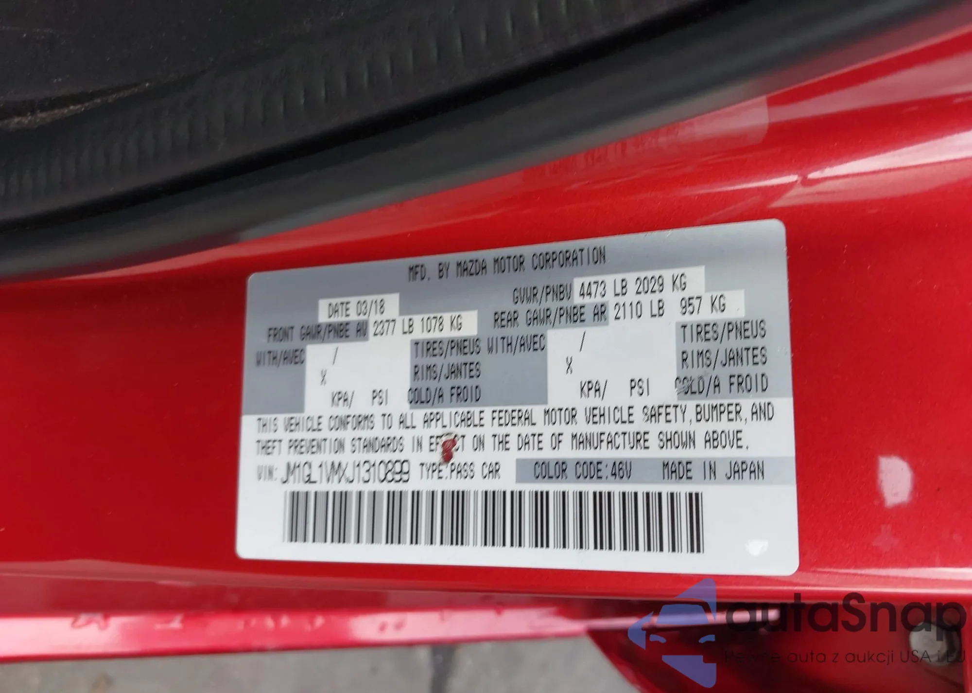 Samochód Mazda 6 2018 (VIN JM1GL1VMXJ1310899) nie był wcześniej licytowany. Dokumenty są czyste, przebieg odpowiada lub jest niższy niż średnia rynku. Sprzedaje go firma ubezpieczeniowa – polecamy zakup. Dostawa do portu zajmie ok. 6–8 tygodni.
