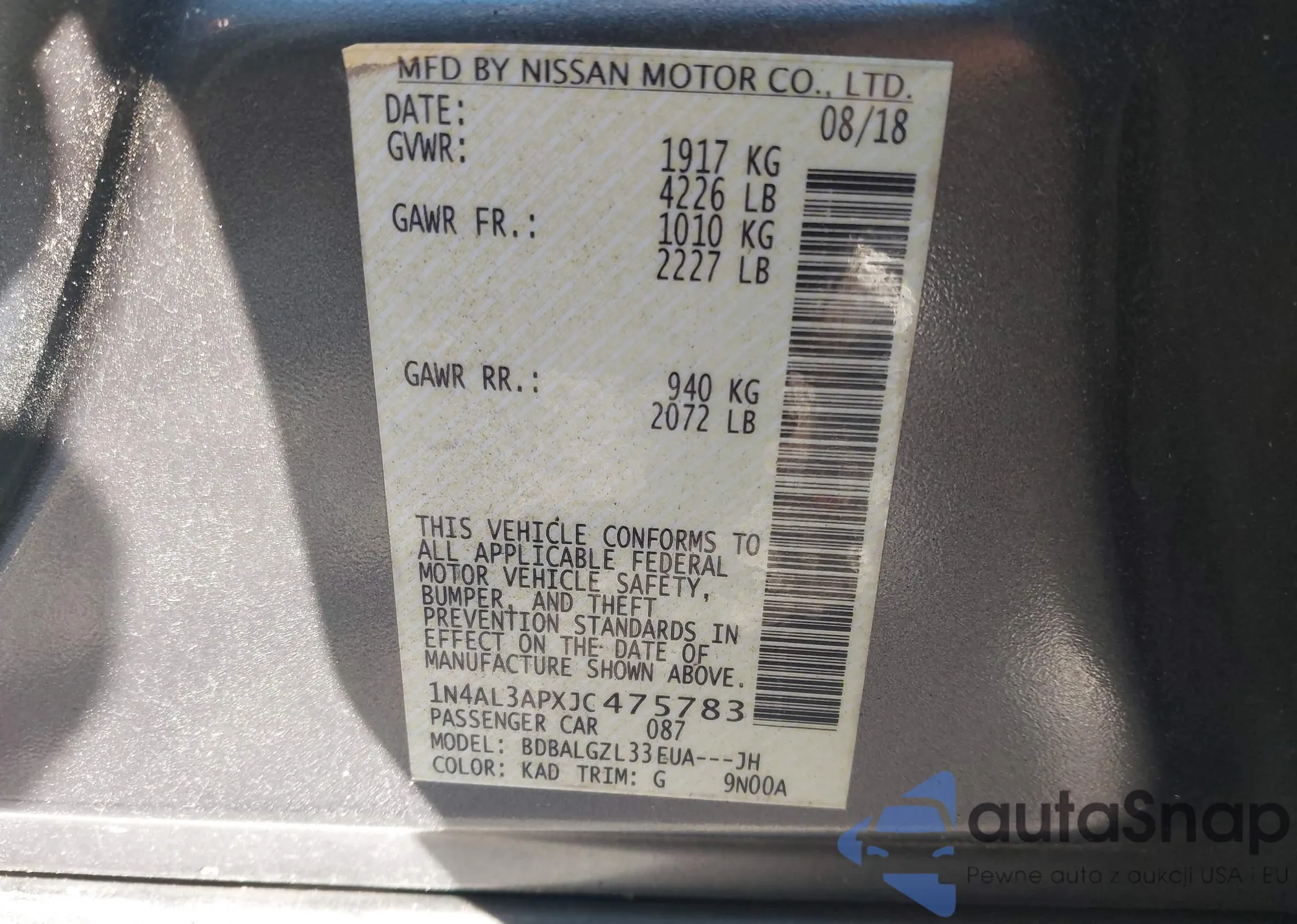 VIN: 1N4AL3APXJC475783