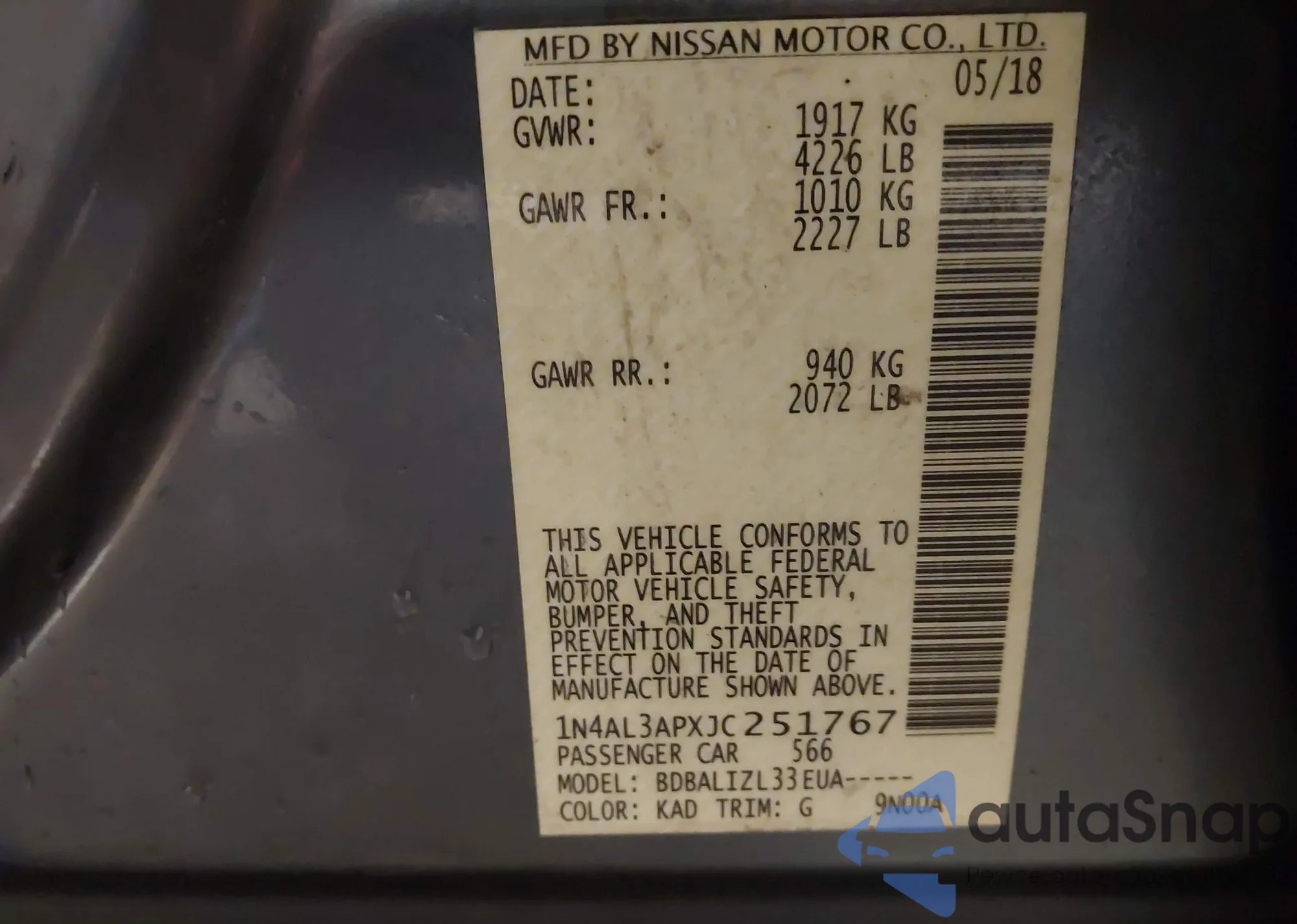VIN: 1N4AL3APXJC251767