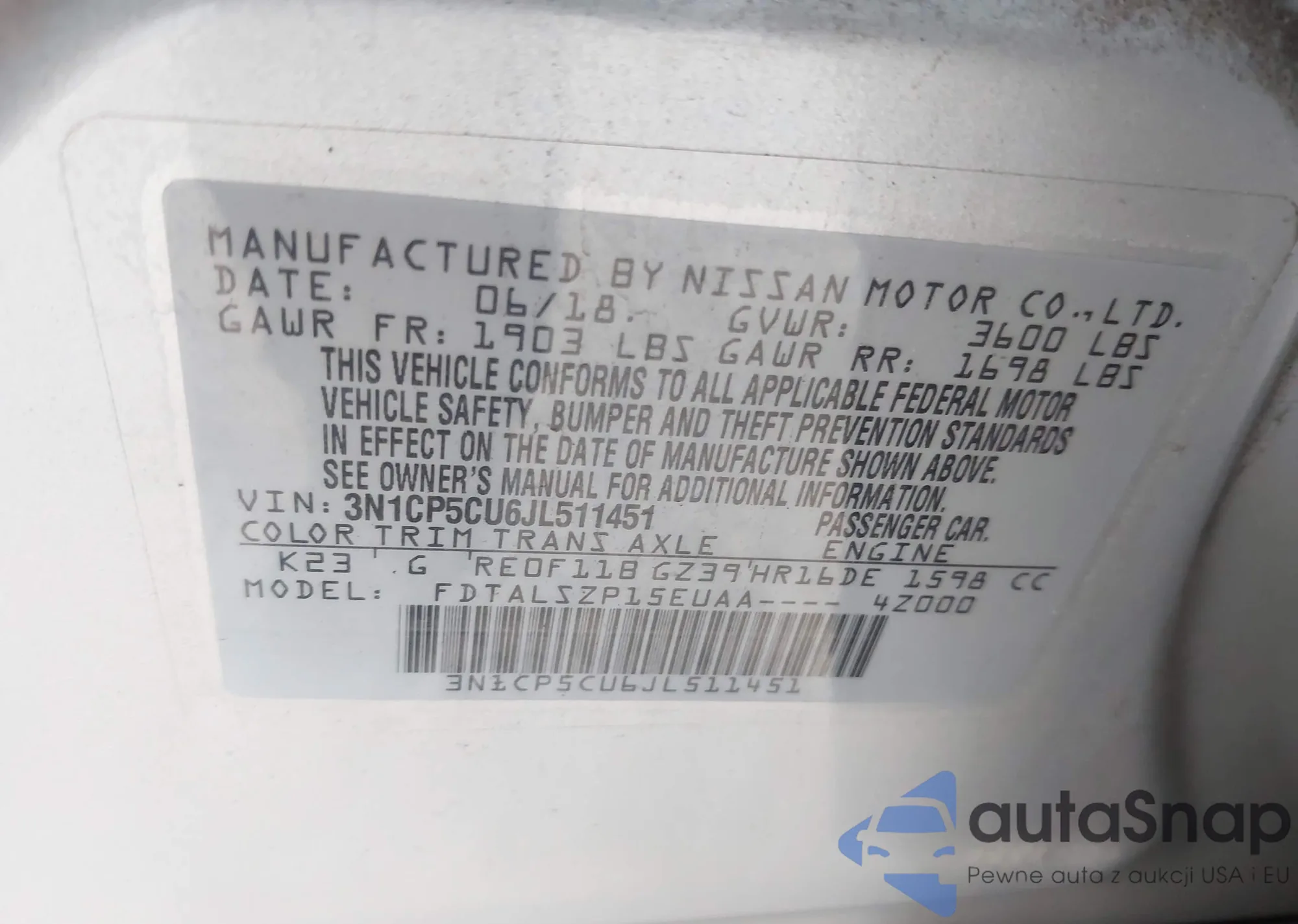 Samochód Nissan Kicks 2018 (VIN 3N1CP5CU6JL511451) ma dokumenty uniemożliwiające rejestrację. Mogą pojawić się trudności przy eksporcie i rejestracji. Skontaktuj się z ekspertami AutaSnap w celu znalezienia alternatywy.