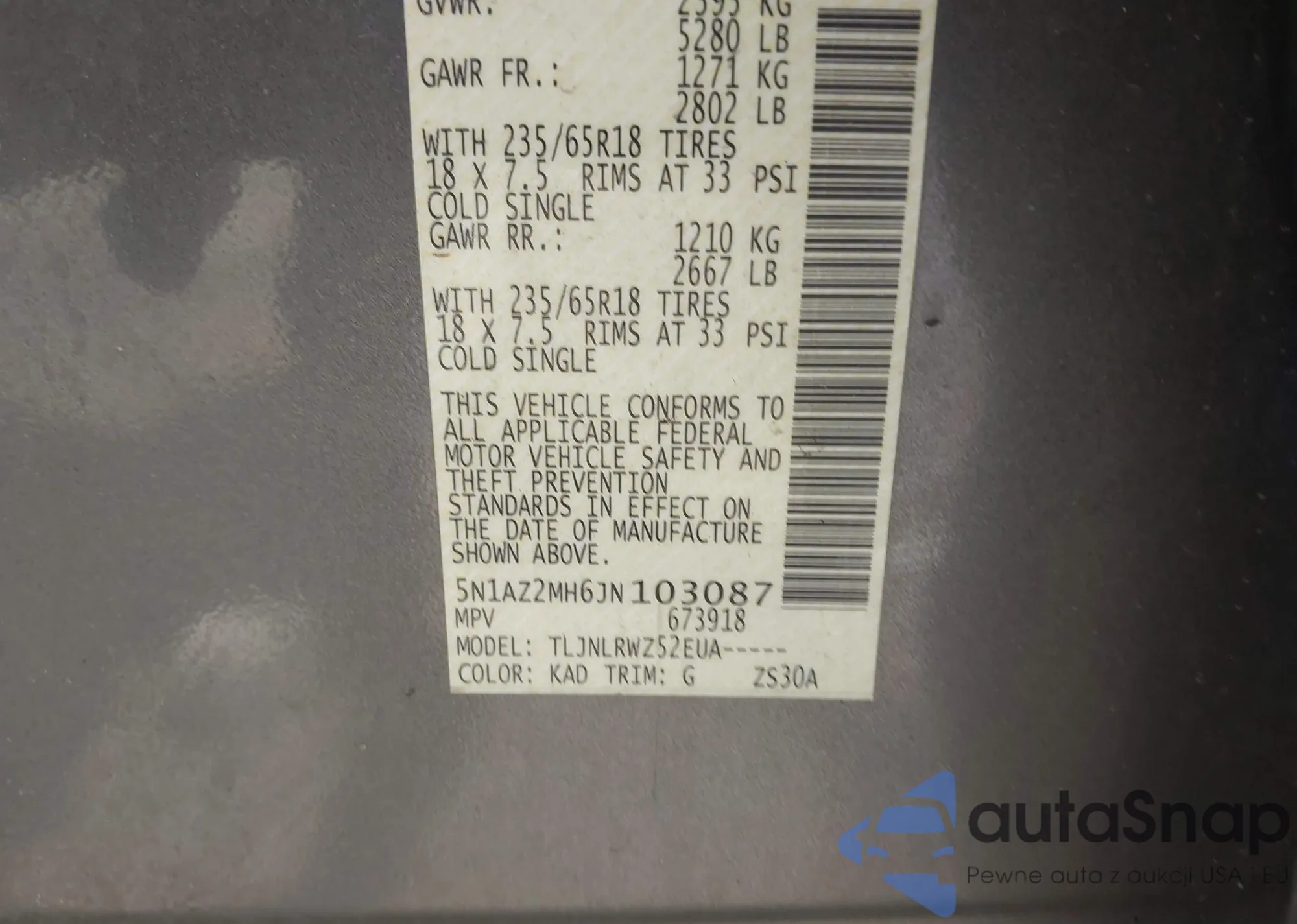 VIN: 5N1AZ2MH6JN103087