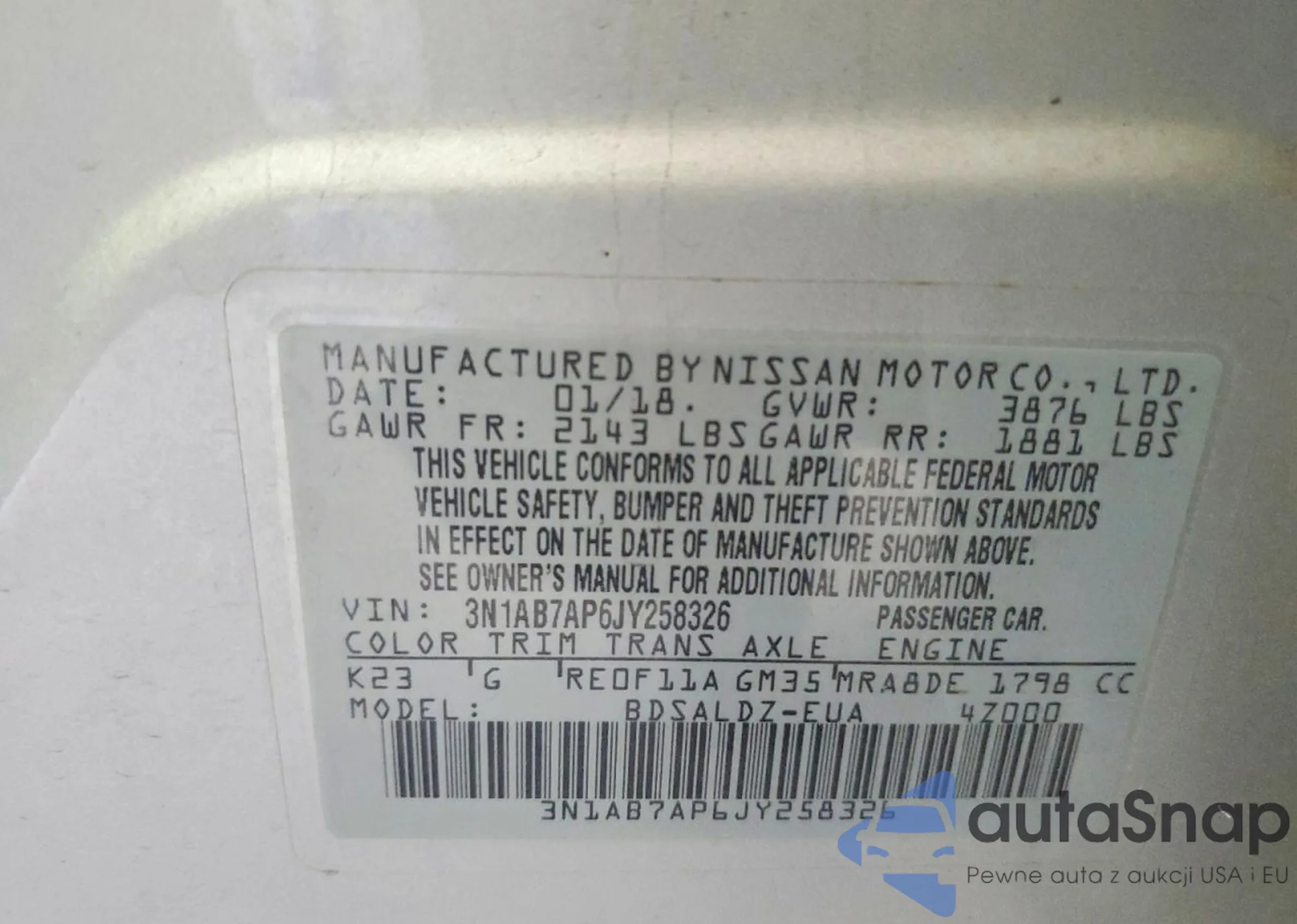 Samochód Nissan Sentra 2018 (VIN 3N1AB7AP6JY258326) nie był wcześniej licytowany. Dokumenty są czyste, przebieg odpowiada lub jest niższy niż średnia rynku. Sprzedaje go firma ubezpieczeniowa – polecamy zakup. Dostawa do portu zajmie ok. 6–8 tygodni.