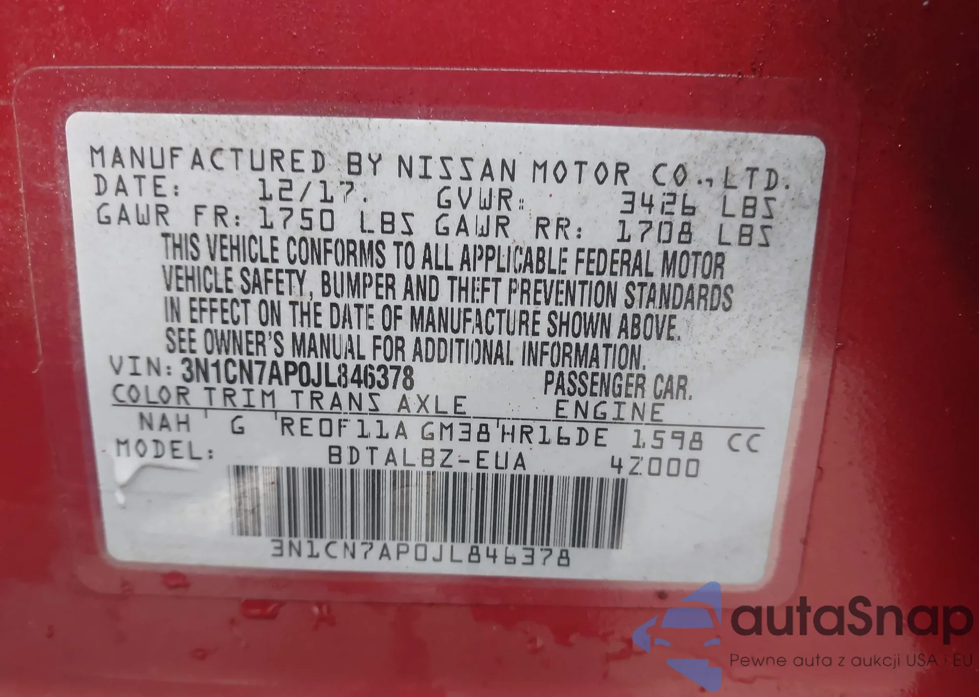 VIN: 3N1CN7AP0JL846378