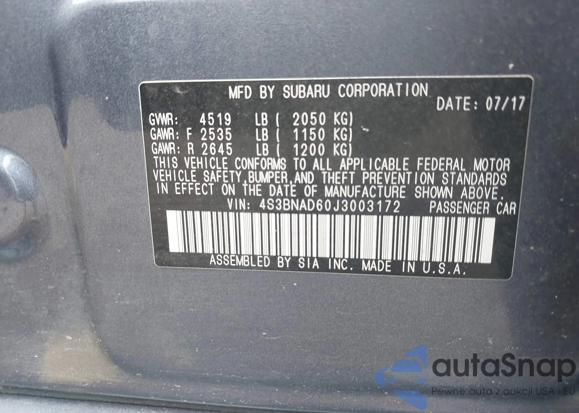 VIN: 4S3BNAD60J3003172