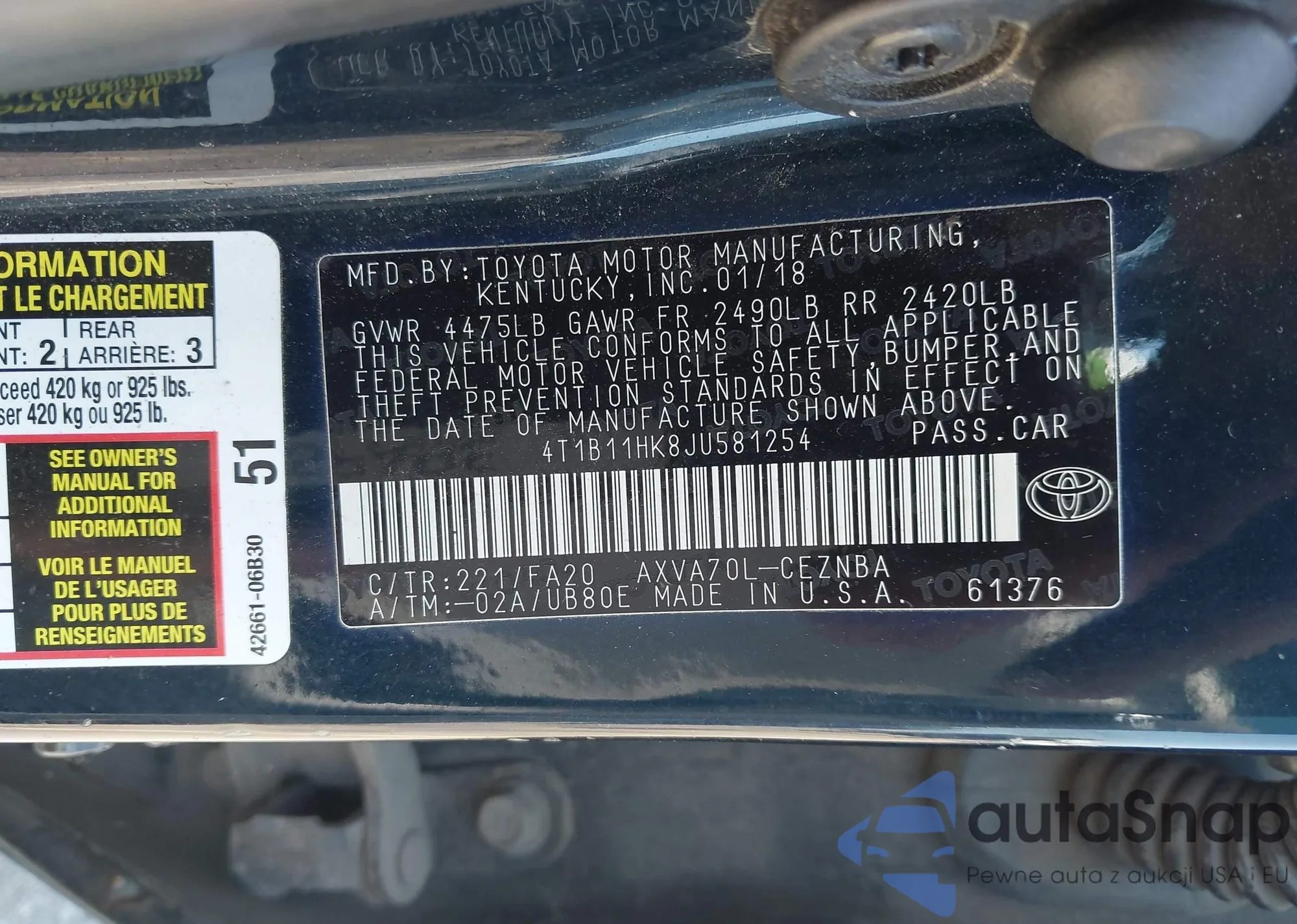 VIN: 4T1B11HK8JU581254