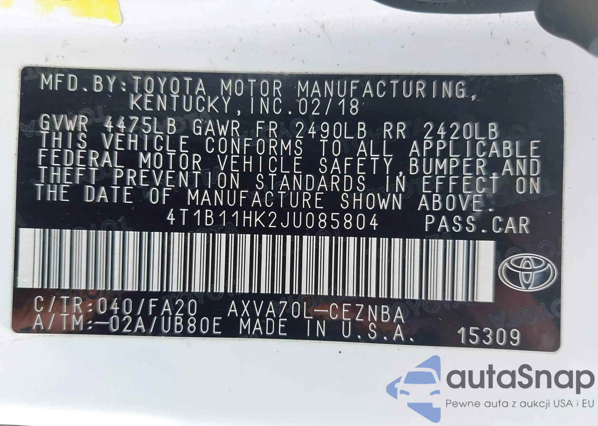 VIN: 4T1B11HK2JU085804