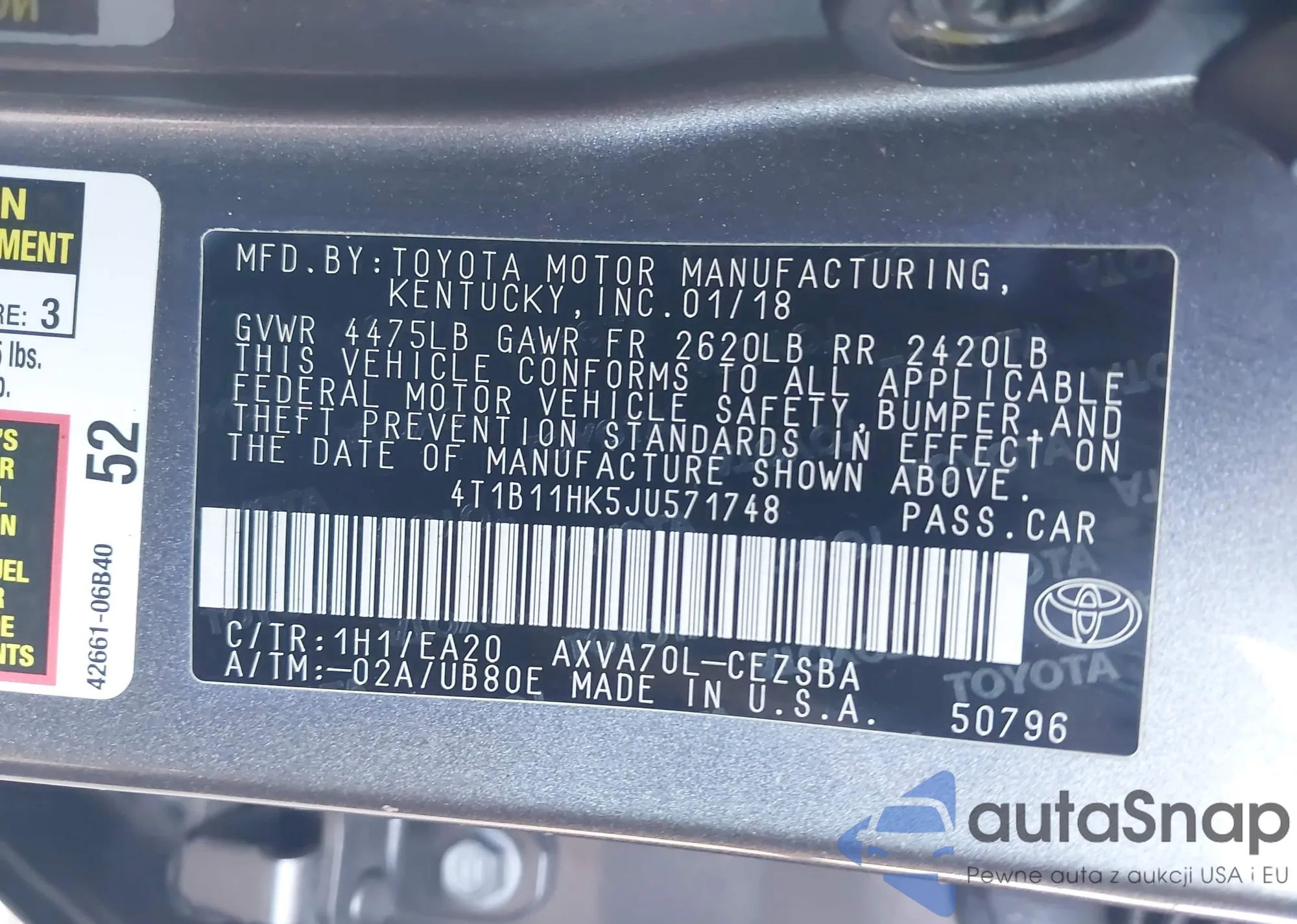 • VIN: 4T1B11HK5JU571748