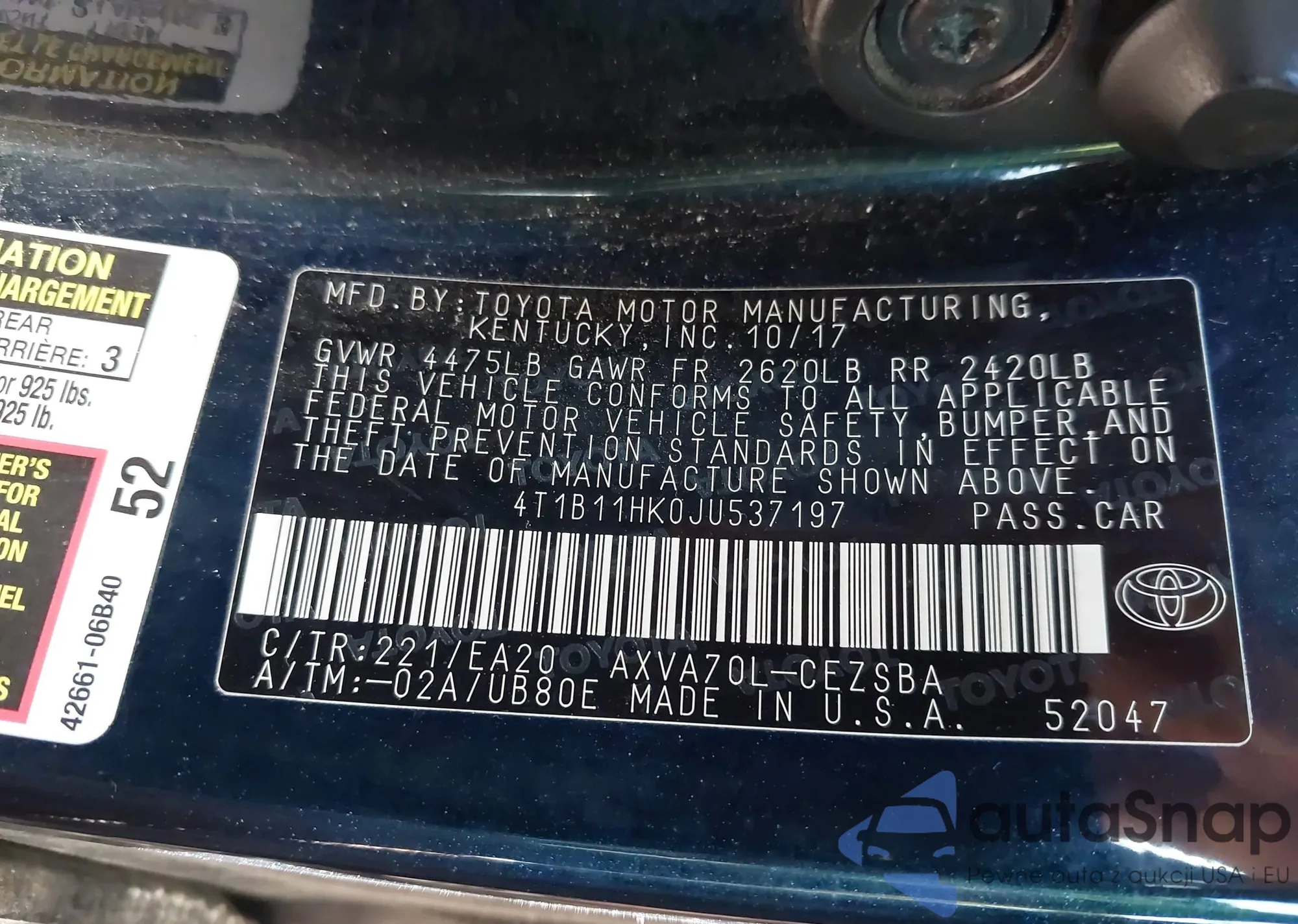 VIN: 4T1B11HK0JU537197