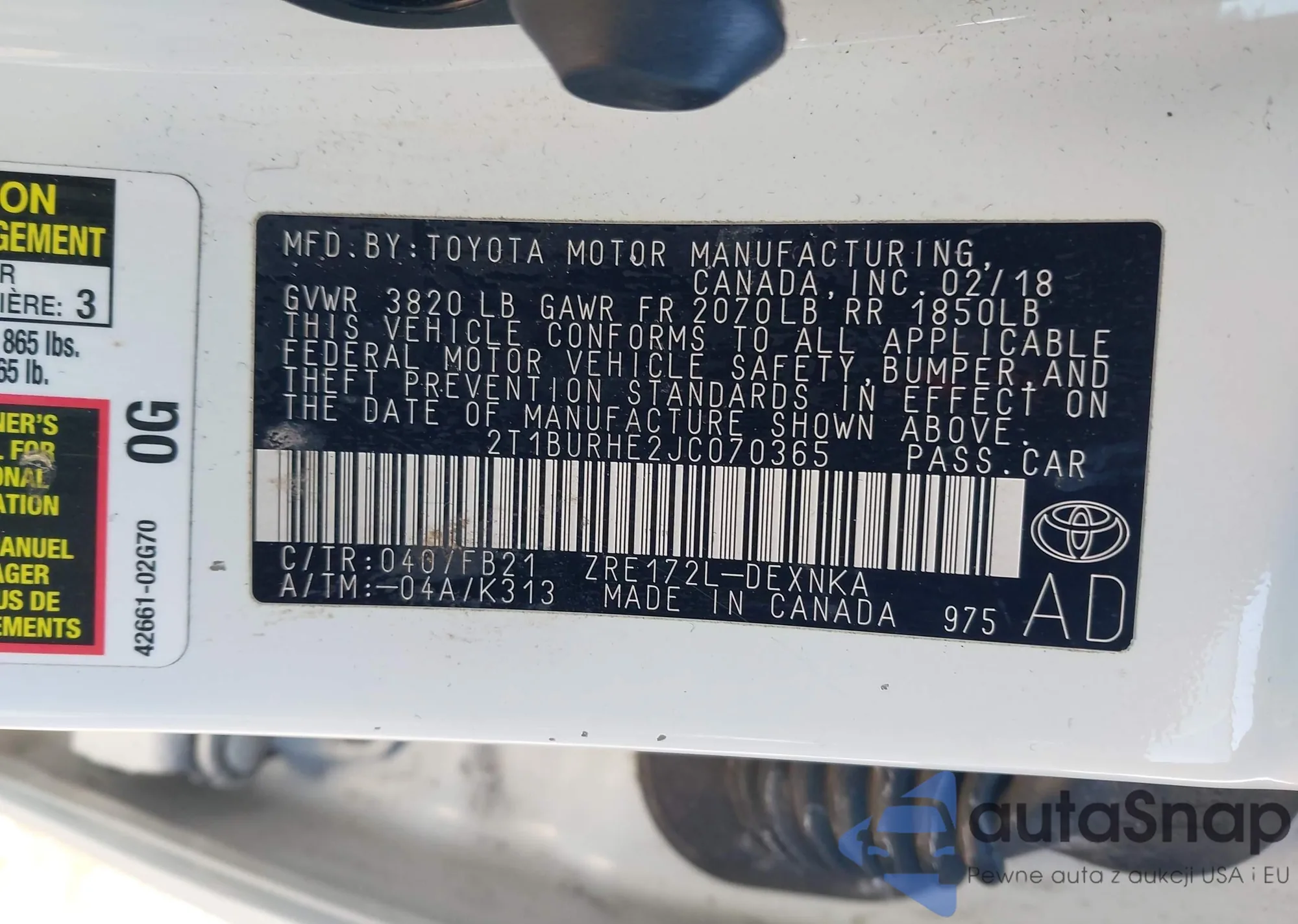 Samochód Toyota Corolla 2018 (VIN 2T1BURHE2JC070365) nie był wcześniej licytowany. Dokumenty są czyste, przebieg odpowiada lub jest niższy niż średnia rynku. Sprzedaje go firma ubezpieczeniowa – polecamy zakup. Dostawa do portu zajmie ok. 6–8 tygodni.