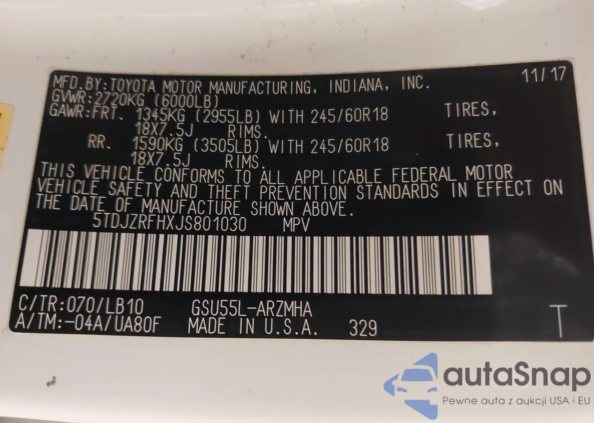 Samochód Toyota Highlander 2018 (VIN 5TDJZRFHXJS801030) nie był wcześniej licytowany. Dokumenty są czyste, przebieg odpowiada lub jest niższy niż średnia rynku. Sprzedaje go firma ubezpieczeniowa – polecamy zakup. Dostawa do portu zajmie ok. 6–8 tygodni.