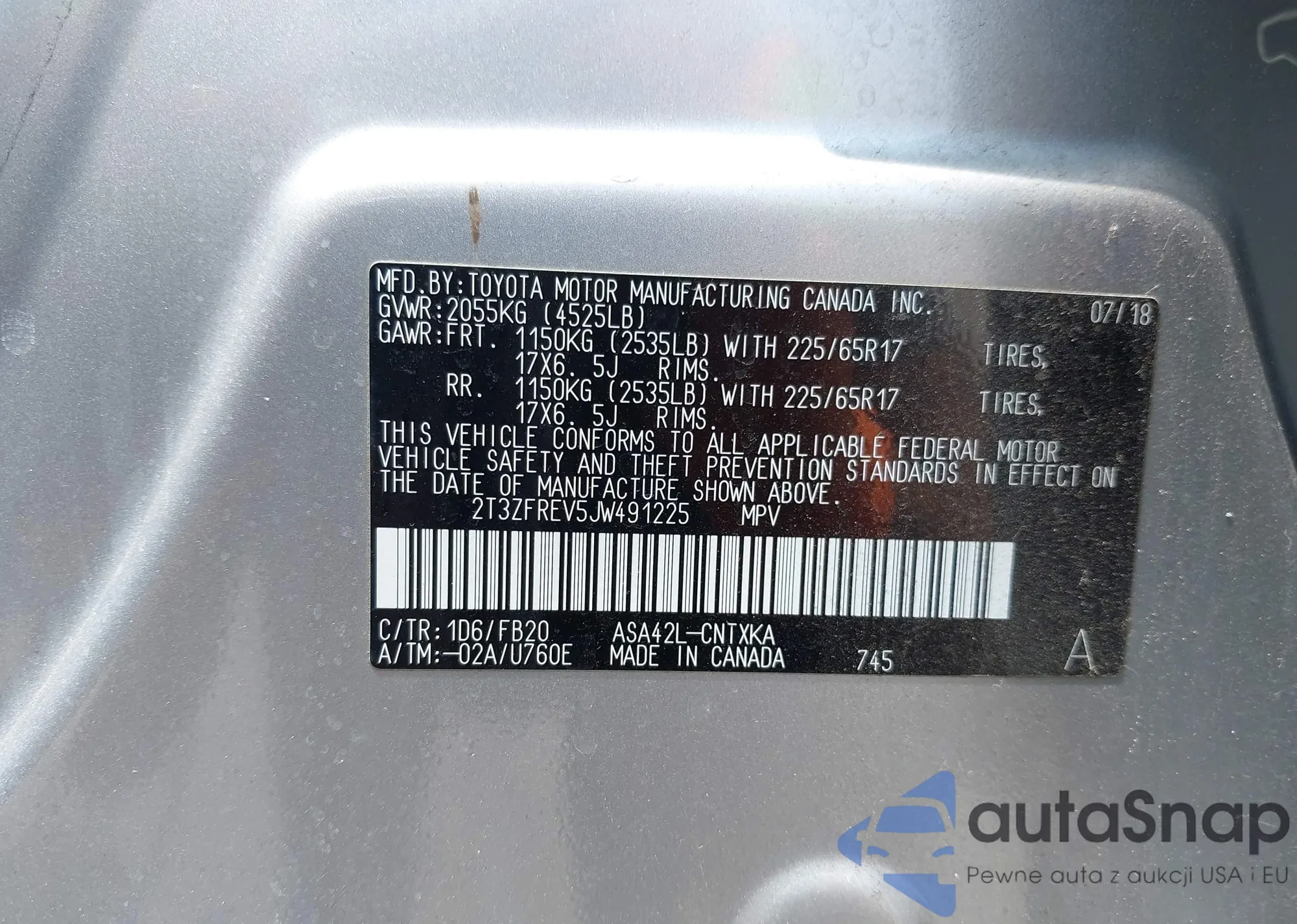 VIN: 2T3ZFREV5JW491225