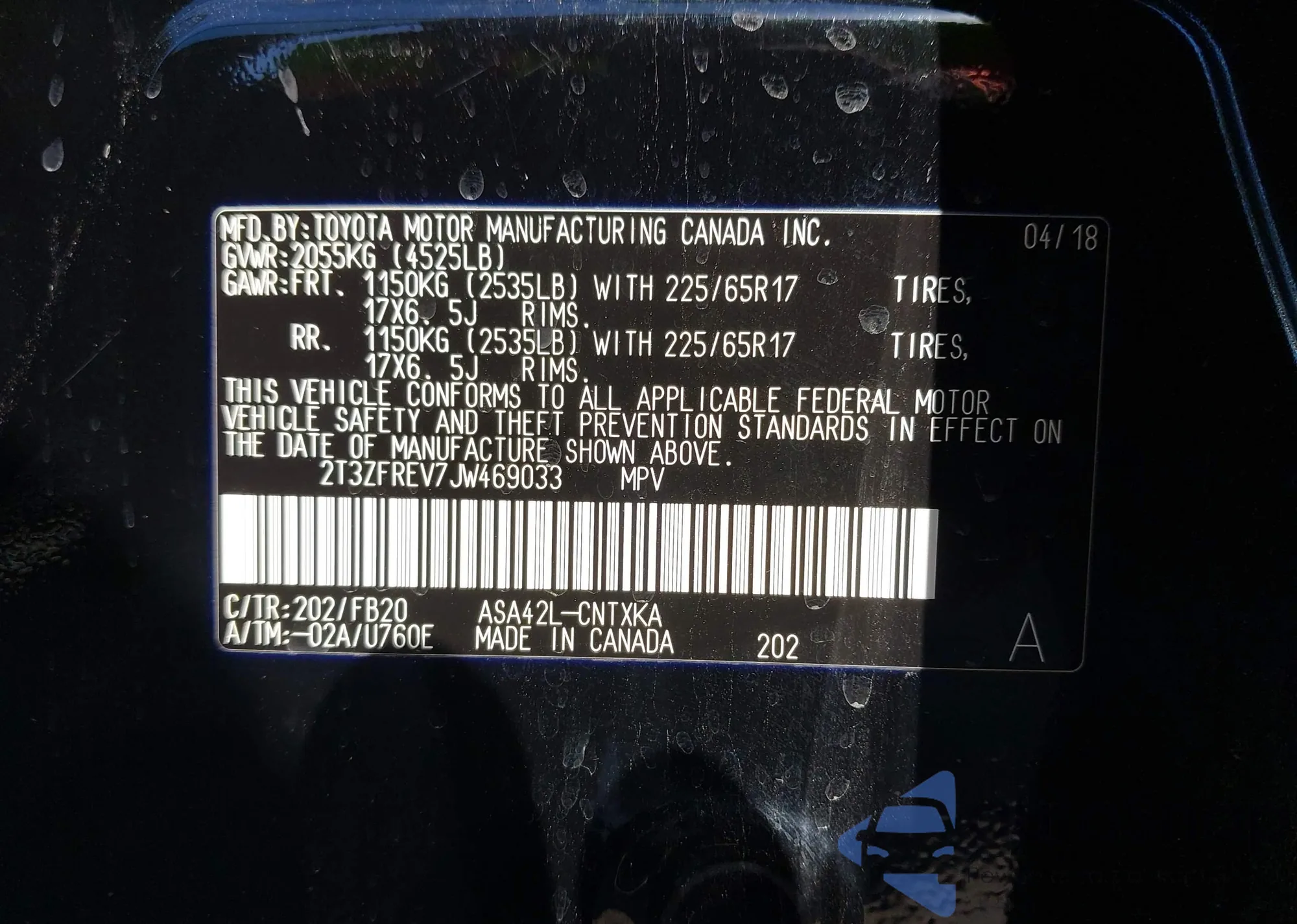 VIN: 2T3ZFREV7JW469033