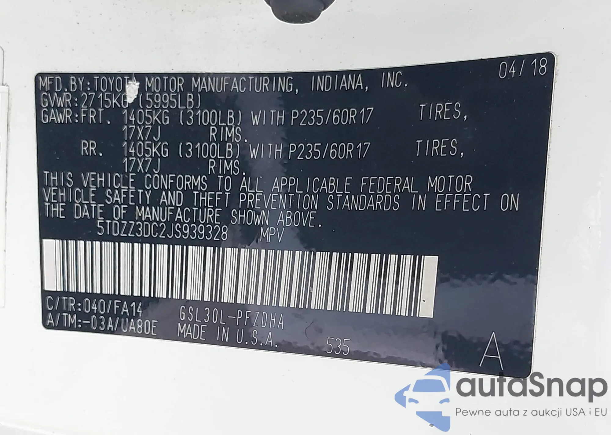 VIN: 5TDZZ3DC2JS939328