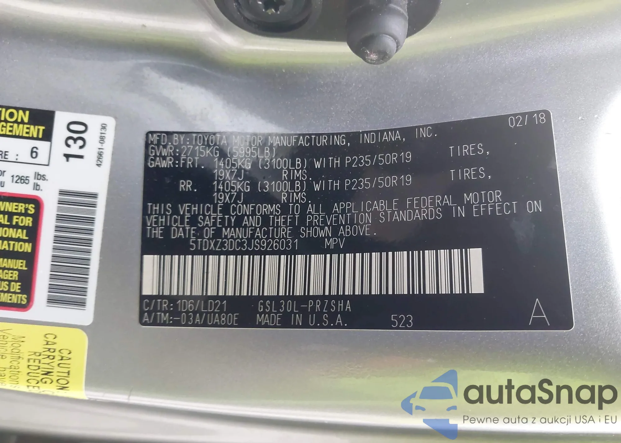 Samochód Toyota Sienna 2018 (VIN 5TDXZ3DC3JS926031) nie był wcześniej licytowany. Dokumenty są czyste, przebieg odpowiada lub jest niższy niż średnia rynku. Sprzedaje go firma ubezpieczeniowa – polecamy zakup. Dostawa do portu zajmie ok. 6–8 tygodni.