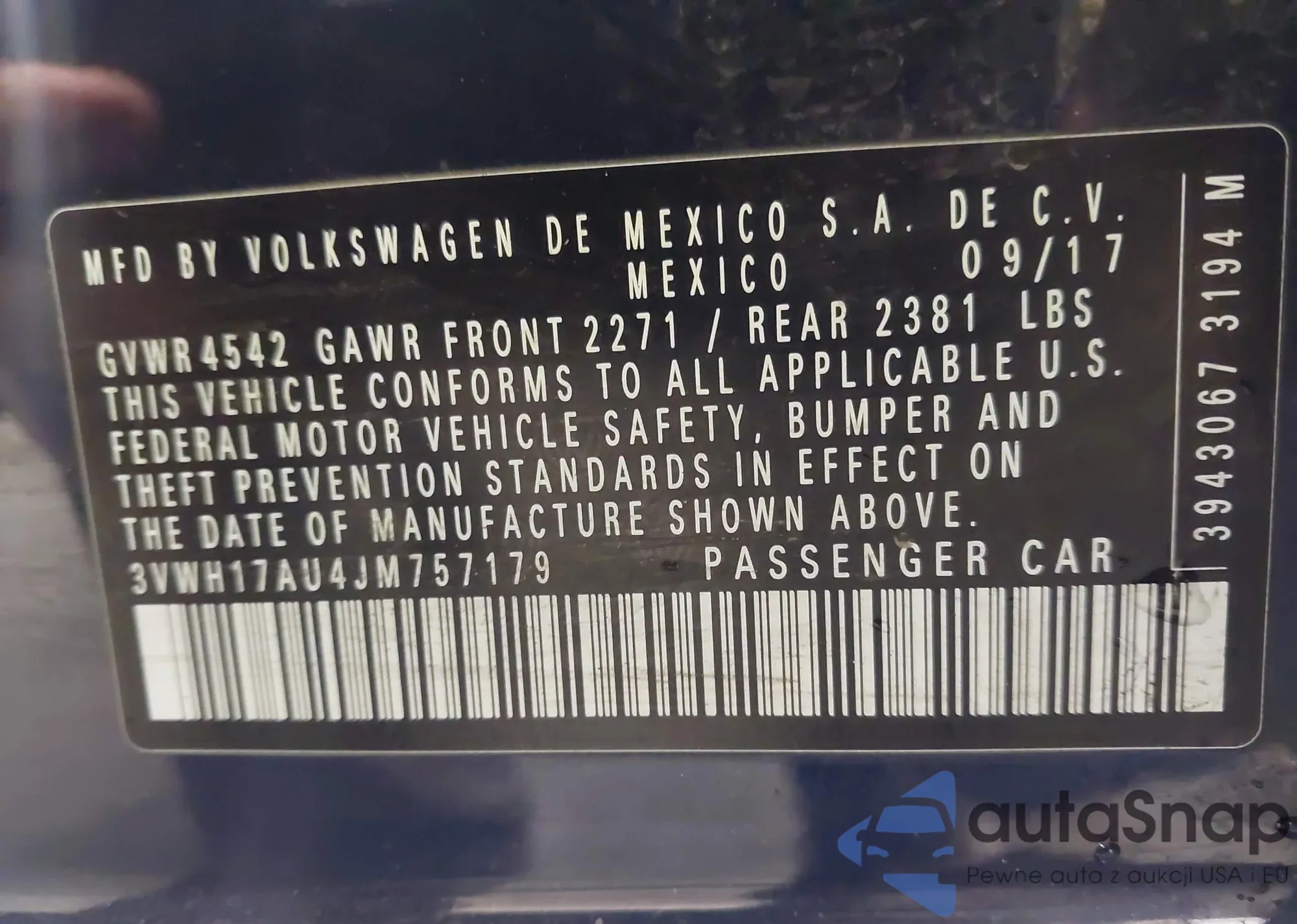 Samochód Volkswagen Golf 2018 (VIN 3VWH17AU4JM757179) ma dokumenty uniemożliwiające rejestrację. Mogą pojawić się trudności przy eksporcie i rejestracji. Skontaktuj się z ekspertami AutaSnap w celu znalezienia alternatywy.