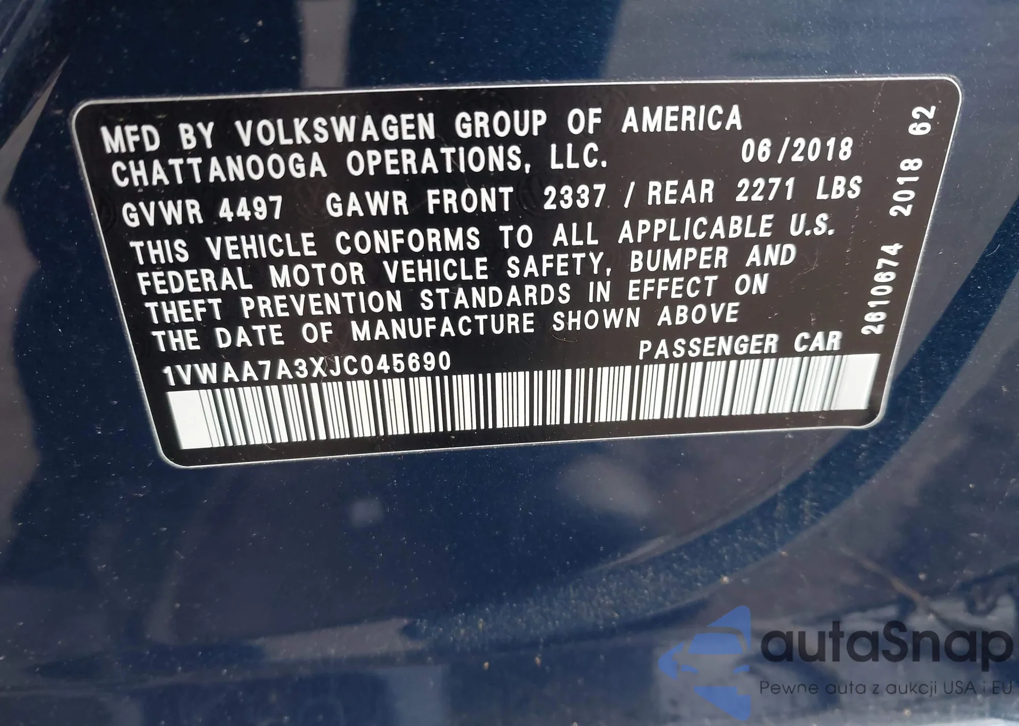 Samochód Volkswagen Passat 2018 (VIN 1VWAA7A3XJC045690) nie był wcześniej licytowany. Dokumenty są czyste, przebieg odpowiada lub jest niższy niż średnia rynku. Sprzedaje go firma ubezpieczeniowa – polecamy zakup. Dostawa do portu zajmie ok. 6–8 tygodni.