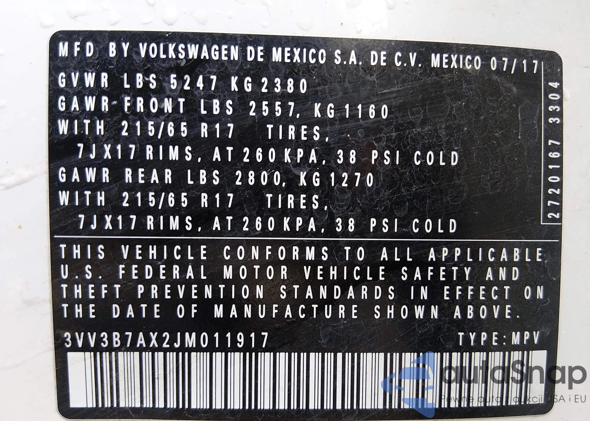 Samochód Volkswagen Tiguan 2018 (VIN 3VV3B7AX2JM011917) nie był wcześniej licytowany. Dokumenty są czyste, przebieg odpowiada lub jest niższy niż średnia rynku. Sprzedaje go firma ubezpieczeniowa – polecamy zakup. Dostawa do portu zajmie ok. 6–8 tygodni.