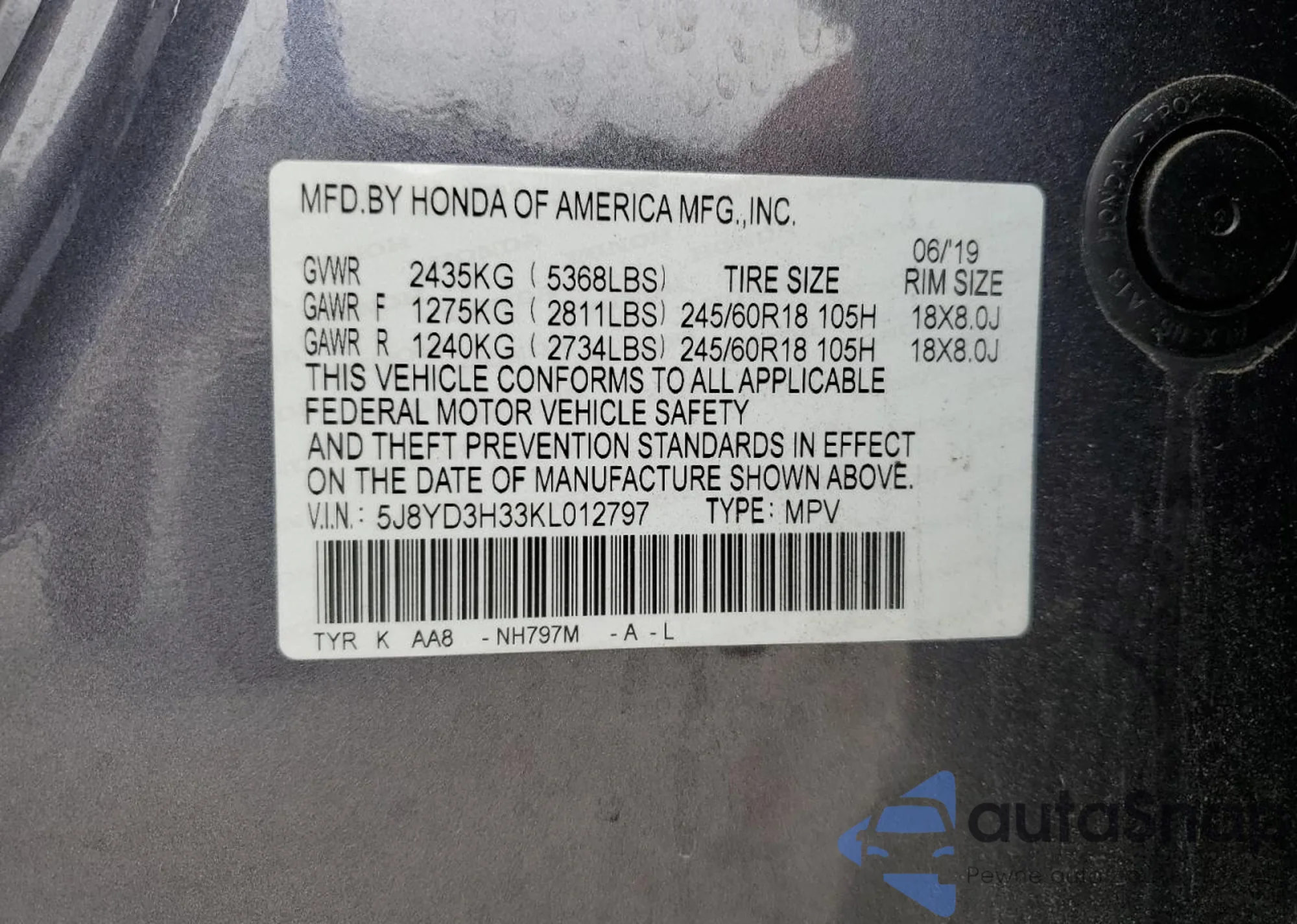 VIN: 5J8YD3H33KL012797