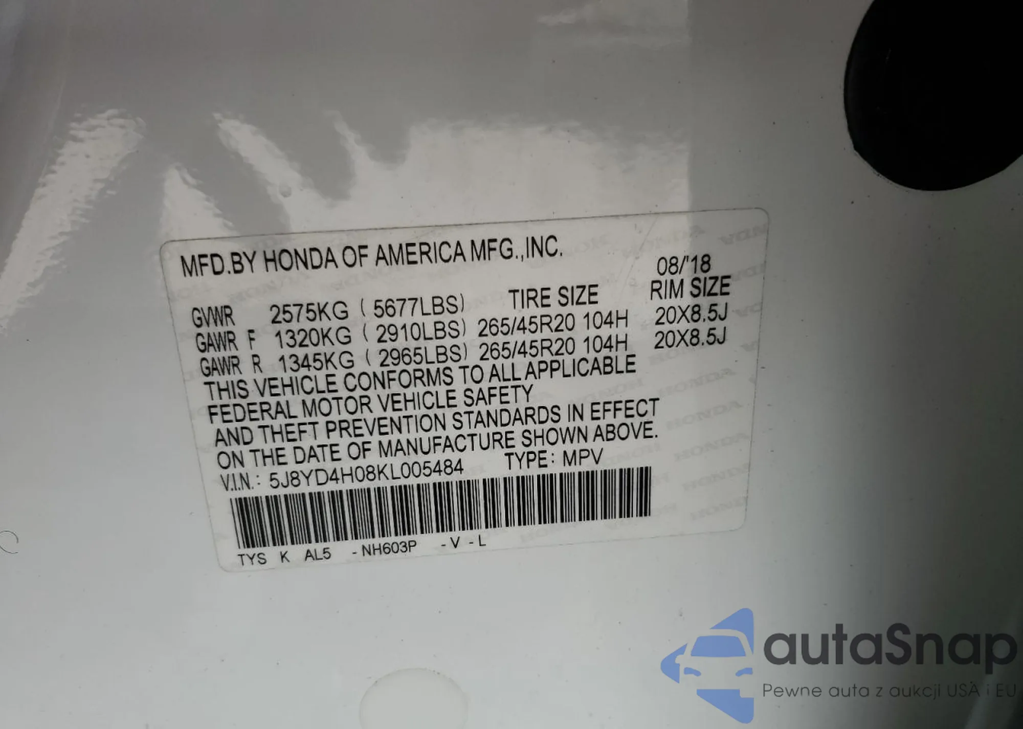 VIN: 5J8YD4H08KL005484
