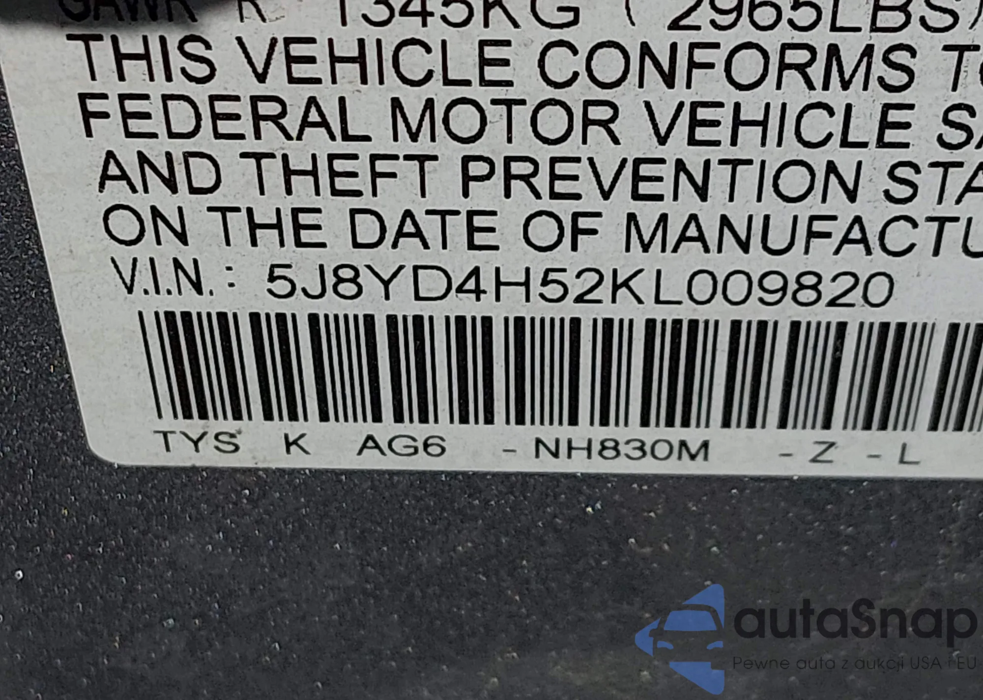 • VIN: 5J8YD4H52KL009820