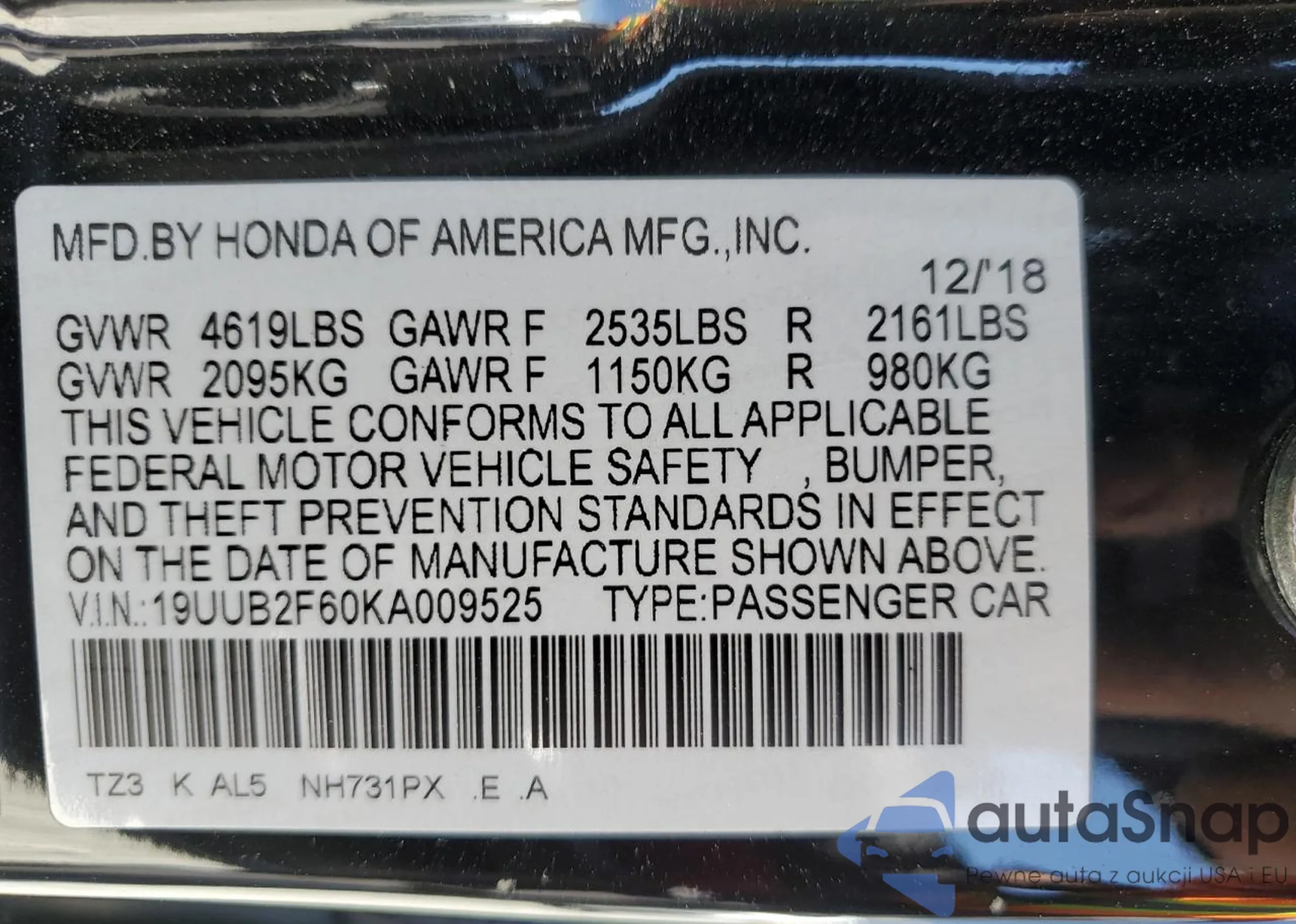 VIN: 19UUB2F60KA009525