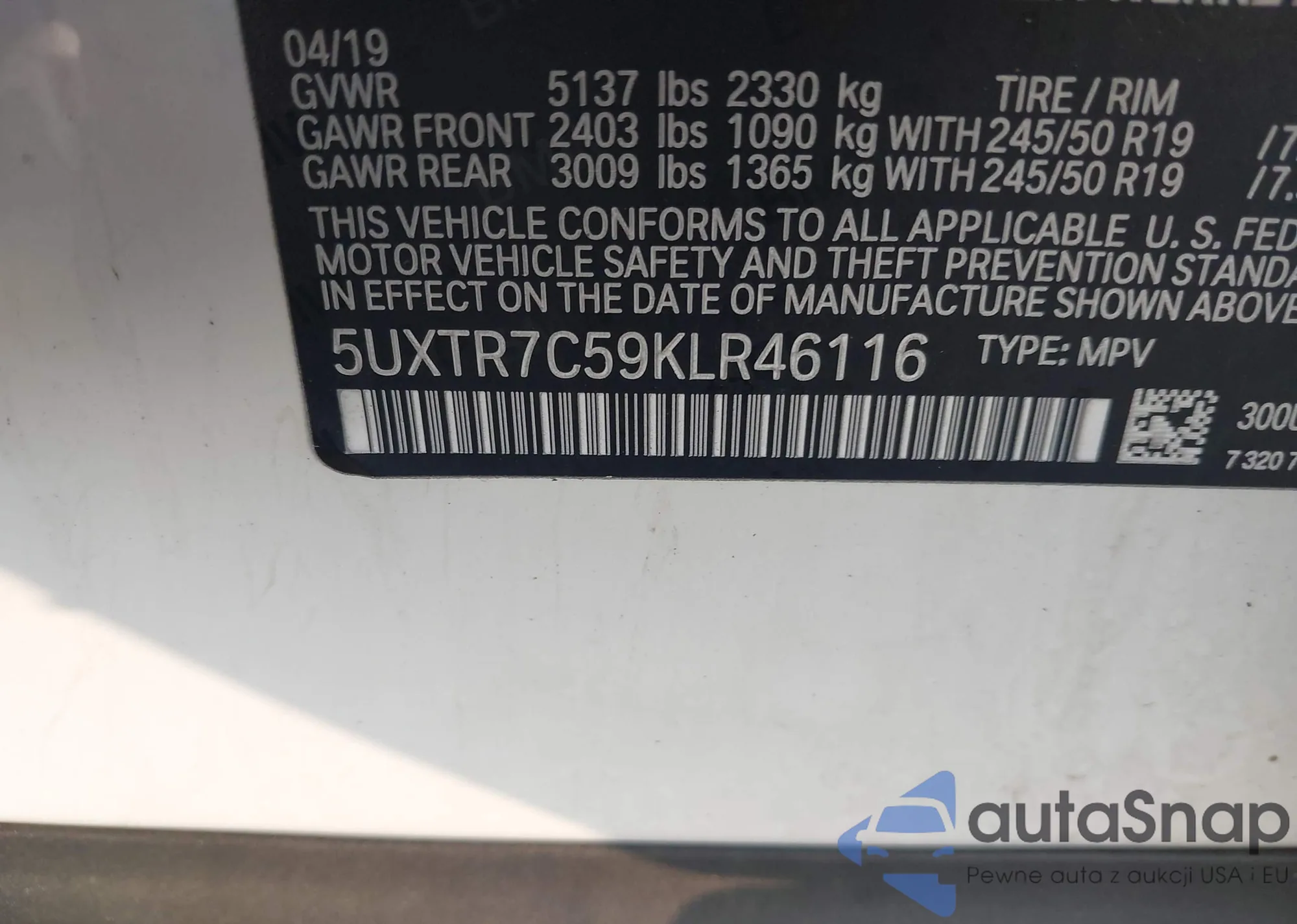 • VIN: 5UXTR7C59KLR46116