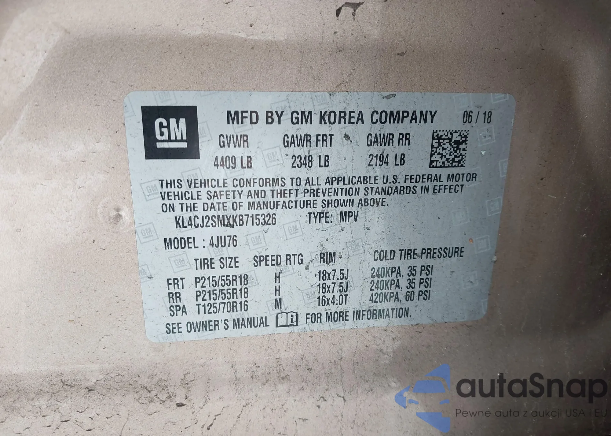 VIN: KL4CJ2SMXKB715326