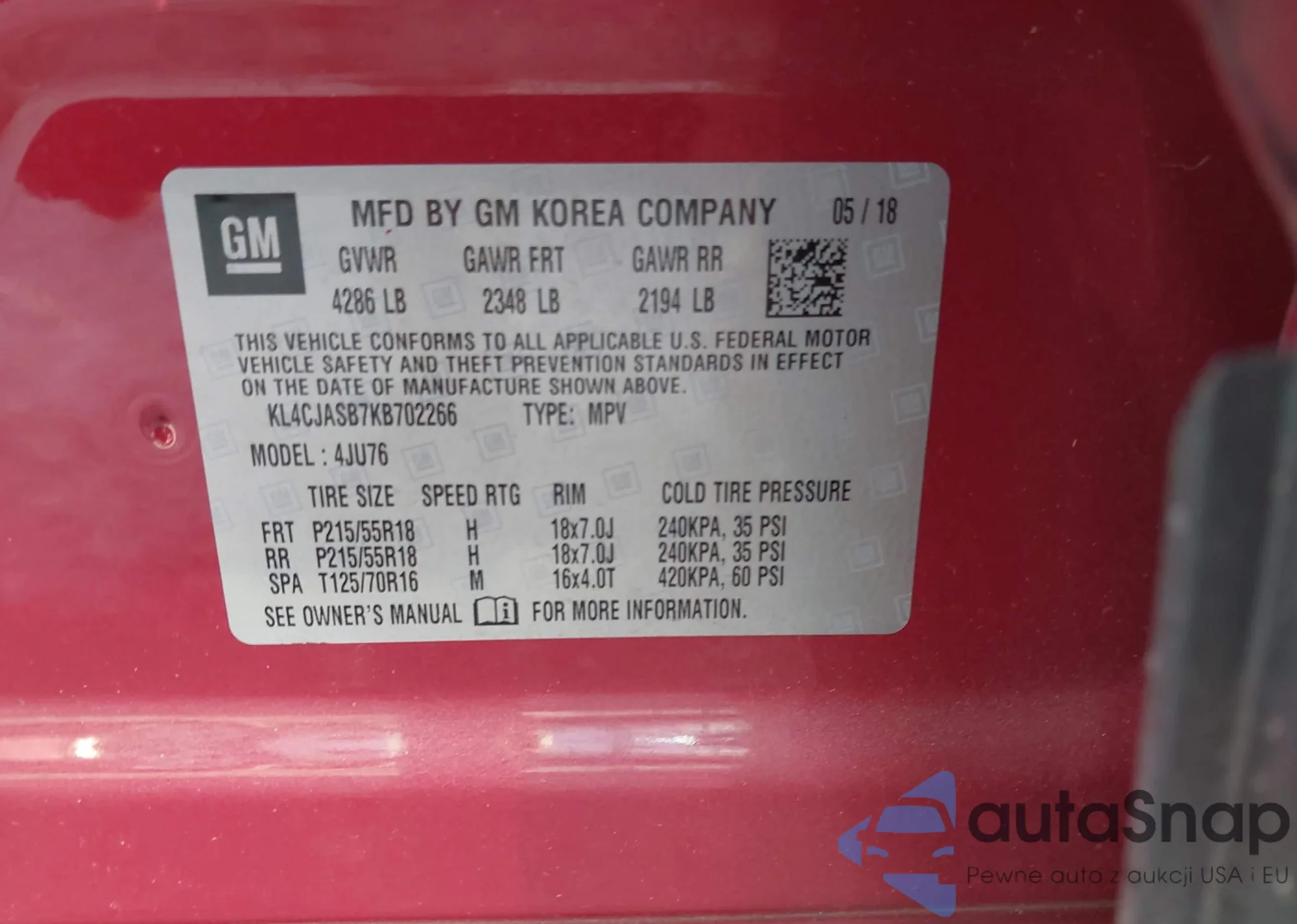 Samochód Buick Encore 2019 (VIN KL4CJASB7KB702266) ma dokumenty uniemożliwiające rejestrację. Mogą pojawić się trudności przy eksporcie i rejestracji. Skontaktuj się z ekspertami AutaSnap w celu znalezienia alternatywy.
