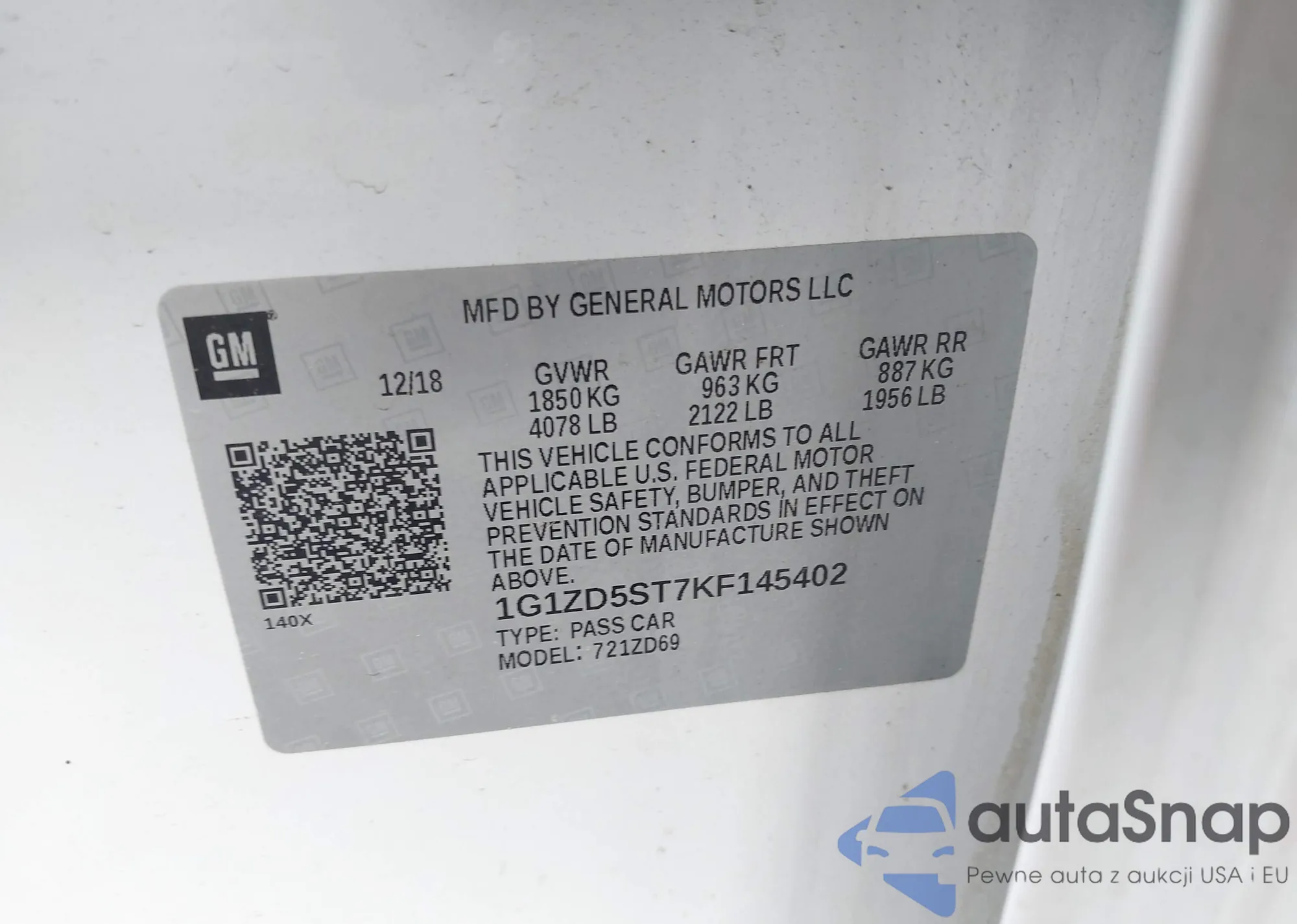 VIN: 1G1ZD5ST7KF145402